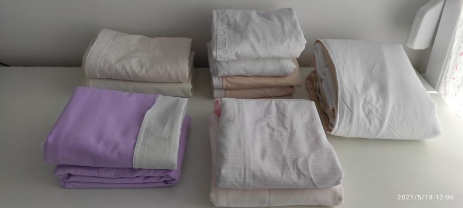 2 kompleta.. navlaka za poplun s ogradicom, jedna deblja navlaka s poplunom u koji jos moze ici deka ili poplun, 2 navlake za poplun, 2 nepromocive plahte i 2 obicne plahte..