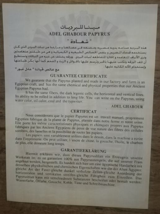 Svaki papirus je dimenzija 32 x 23 cm i odlicne kvalitete. Cijena je 17 eura po primjerku