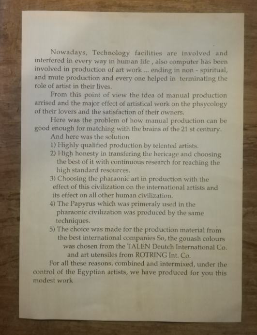 Svaki crtež ima staga potvrdu da je to autohtoni egipatski proizvod. Priložio sam sliku potvrde.