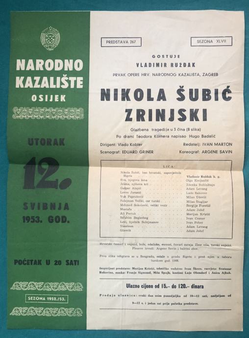 NARODNO KAZALIŠTE OSIJEK - PLAKAT ZA PREDSTAVU N.Š. ZRINSKI IZ 1952.
