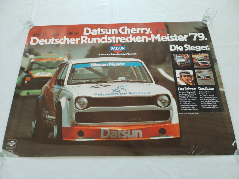 ORIGINALNI PLAKAT POSTER TRKAĆI DATSUN CHERRY, prvak njemačkih kružnih trkališta iz 1979. godine, sa potpisom prvaka vozača, vrlo dobro očuvan, savijen u rolnu, prodajem.