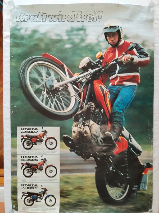 ORIGINALNI VELIKI PLAKAT POSTER HONDA XL 500 S ENDURO, na zadnjem kotaču, dobro do vrlo očuvan, stanje plakata možete vidjeti na slici, savijen u rolnu, prodajem.
