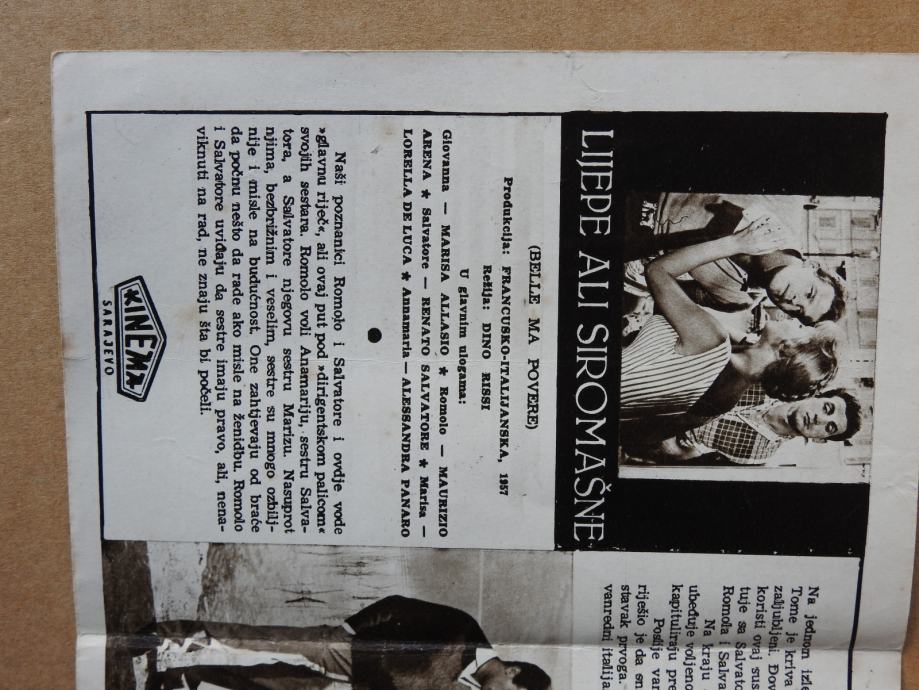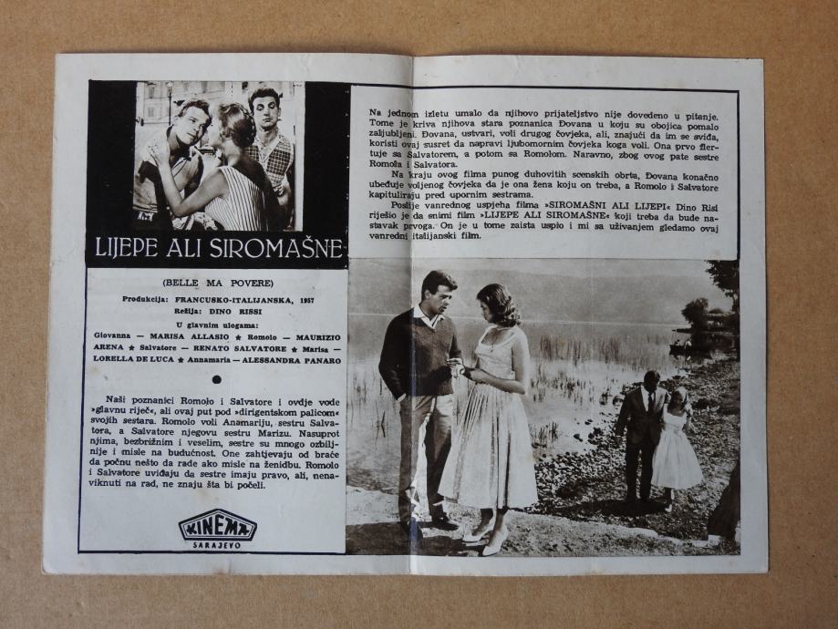 Na prodaju je originalni promotivni prospekt (kino program) za film Lijepe ali siromašne (izvornog naslova Belle ma povere), francusko-talijansku komediju iz 1957. godine u režiji Dina Risija. Film je nastavak uspješnog ostvarenja Siromašni ali lijepi (Poveri ma belli).