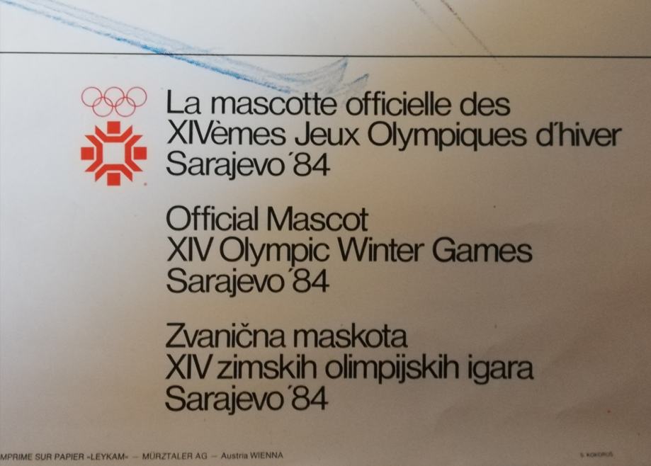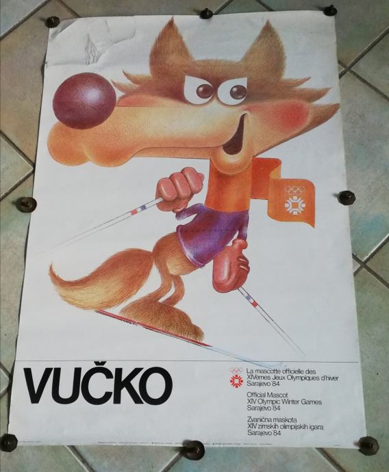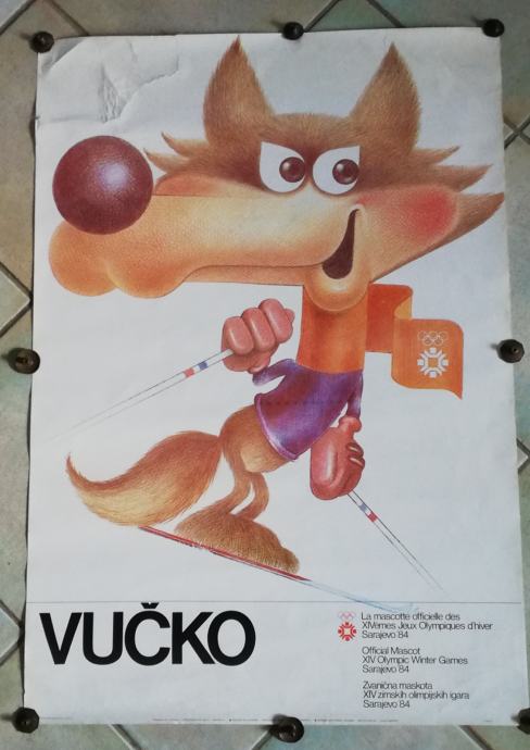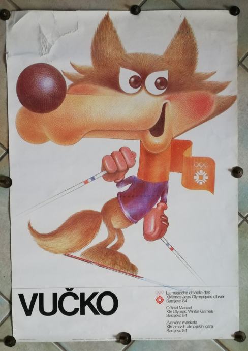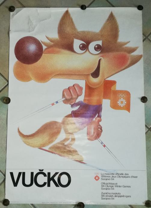 Vučko, službeni plakat XIV. Zimskih olimpijskih igara u Sarajevu 1984.g., design: Kokoruš S. Dimenzije : 98,5 x 70,0 cm. Tisak: Oslobođenje, Sarajevo.
