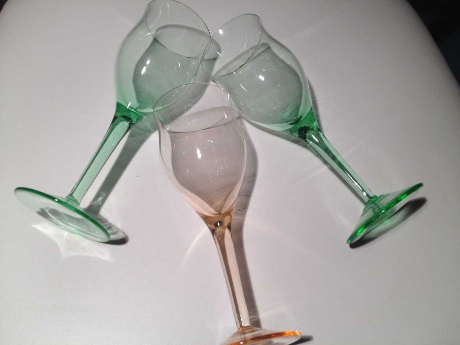 3 čaše za alkoholna pića, nježne boje.