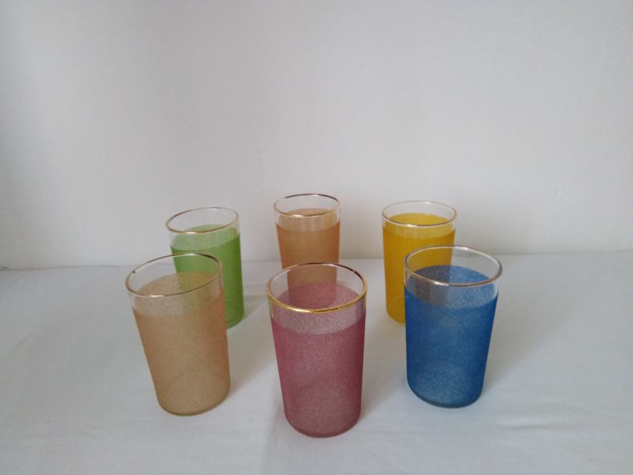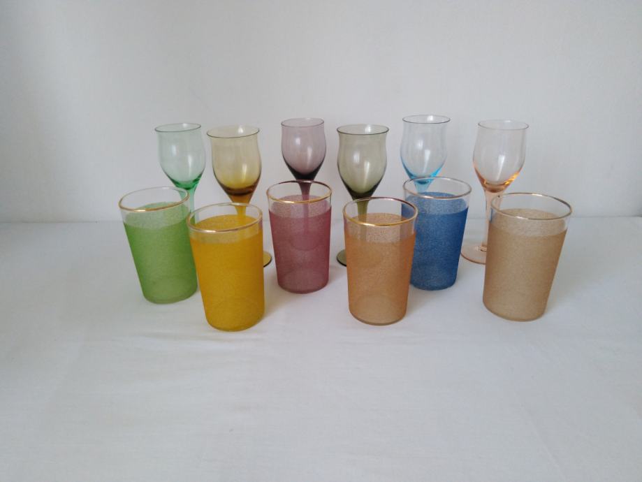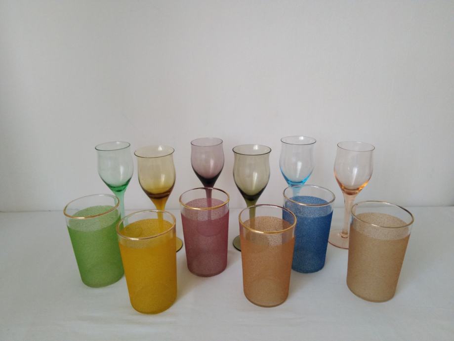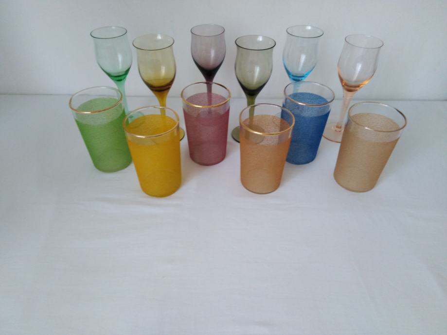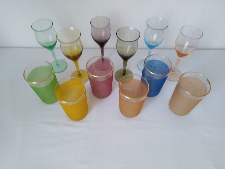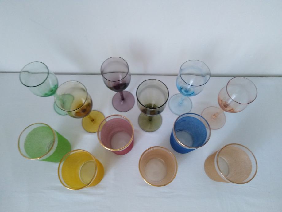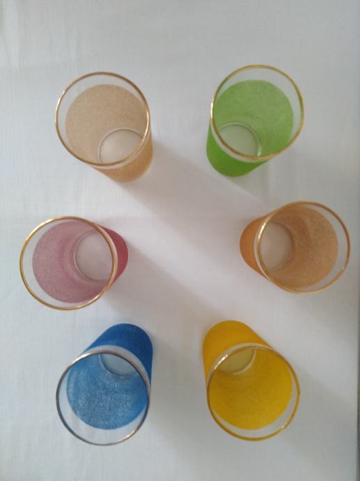 Staklene čaše u boji na stalku Čaše u boji sa zlatnim rubom Vintage