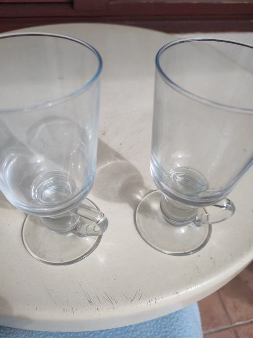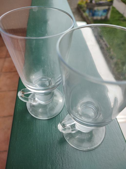Dvije čaše od čvrstog stakla sa stalkom i ručkom. Za posluživanje čaja, kuhanog vina i drugih napitaka. Nekorištene