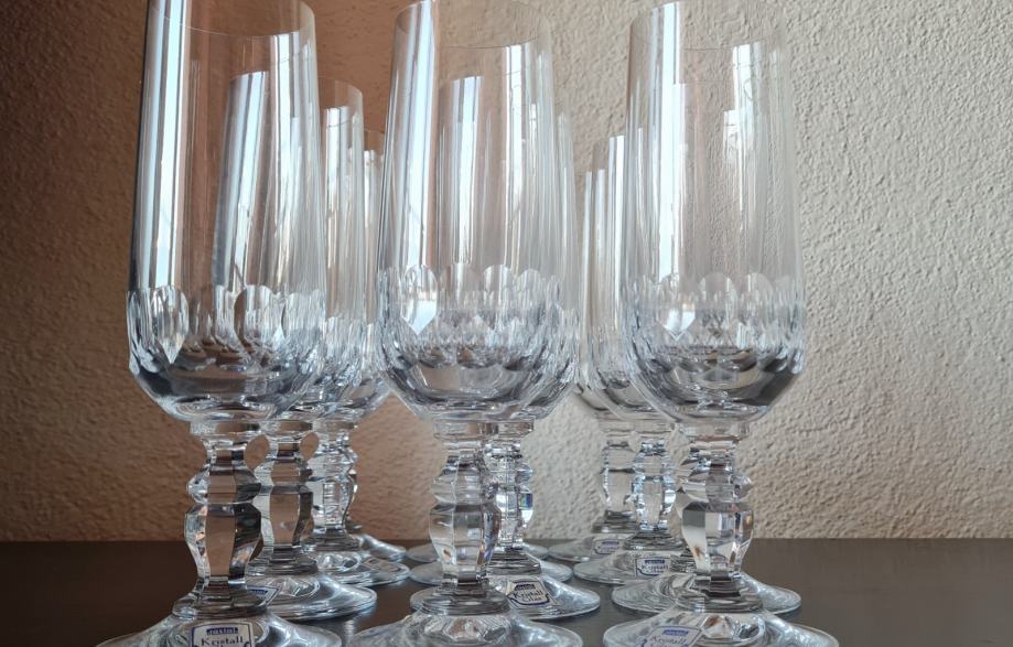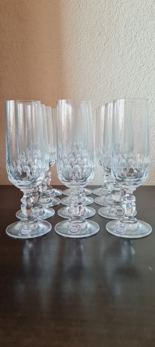 Čaše za šampanjac, kristal. Ima ih 11 komada, 12- a ima gotovo neprimjetno oštećenje na dnu postolja. Neupotrebljavano.