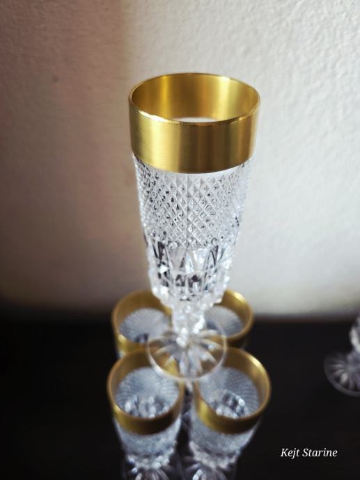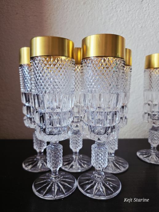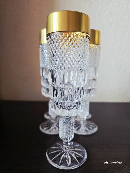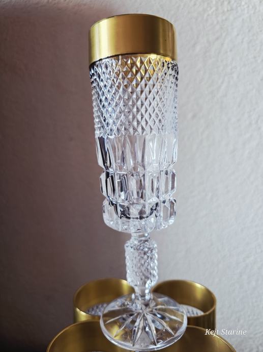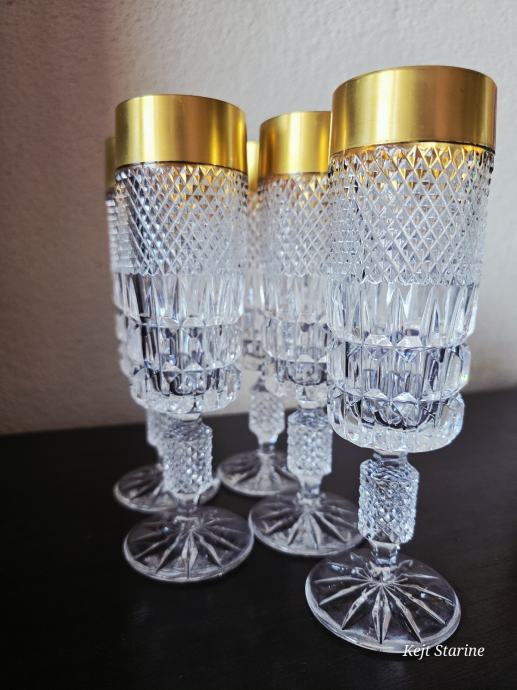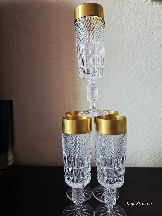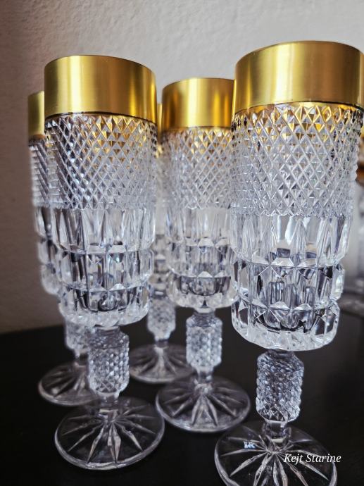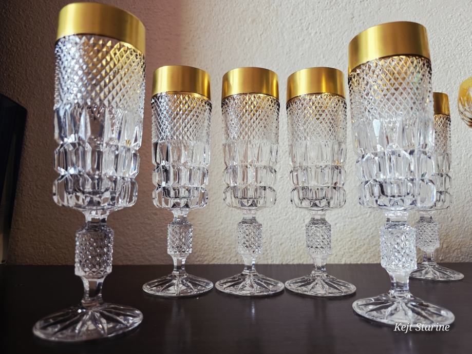 Kristalne čaše, dizajn Karla Klokotschnika (Karl Klokotschnik) za tvrtku Zwiesel (također poznatu kao Schott Zwiesel ili Zwiesel Glas), a specifičan model bi mogao biti dio serije "Victoria Gold". Čaše su izrađene od visokokvalitetnog olovnog kristala i imaju ukrasnu široku traku od poliranog zlata (često 24K zlata) na obodu.
