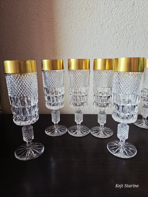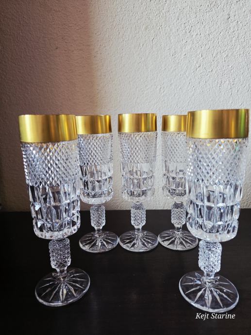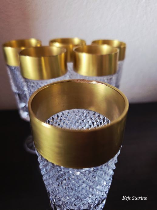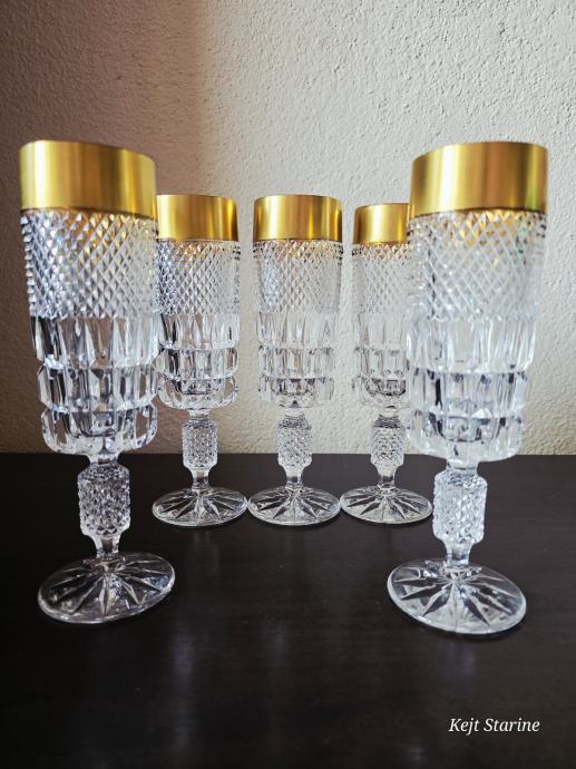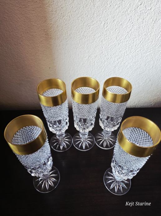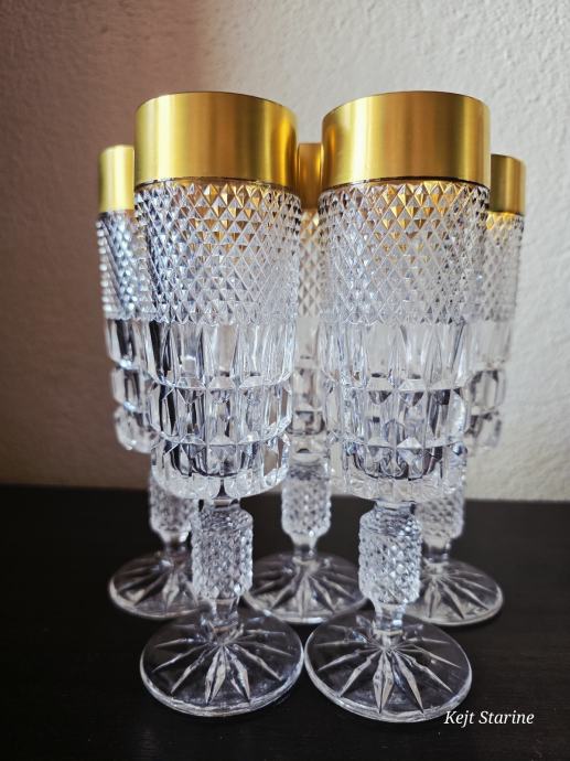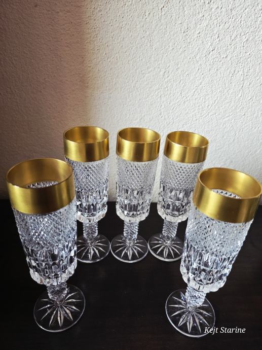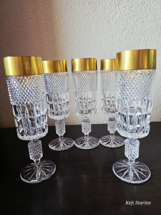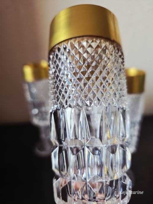 Kristalne čaše, dizajn Karla Klokotschnika (Karl Klokotschnik) za tvrtku Zwiesel (također poznatu kao Schott Zwiesel ili Zwiesel Glas), a specifičan model bi mogao biti dio serije "Victoria Gold". Čaše su izrađene od visokokvalitetnog olovnog kristala i imaju ukrasnu široku traku od poliranog zlata (često 24K zlata) na obodu.