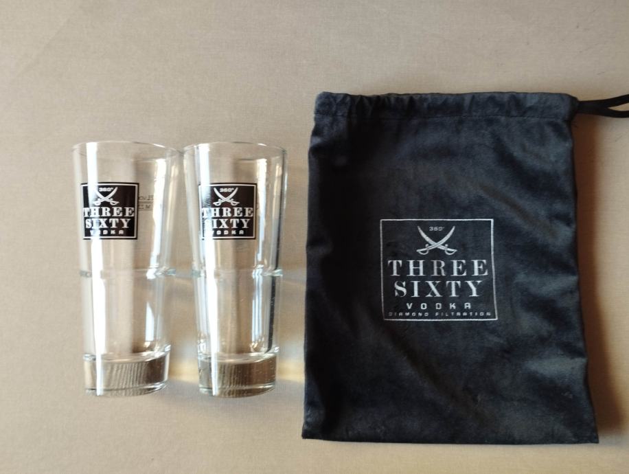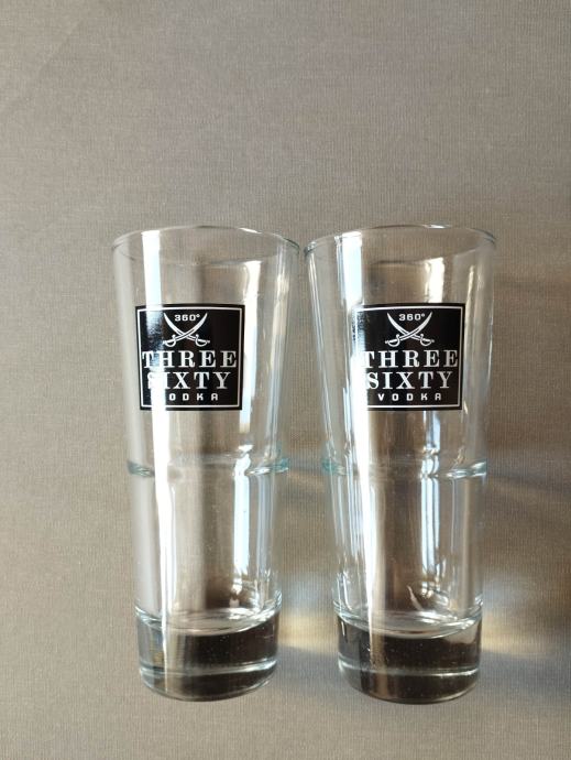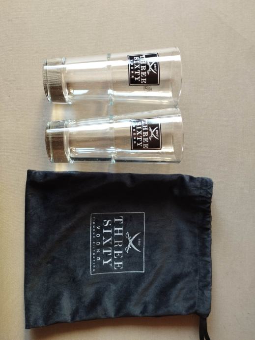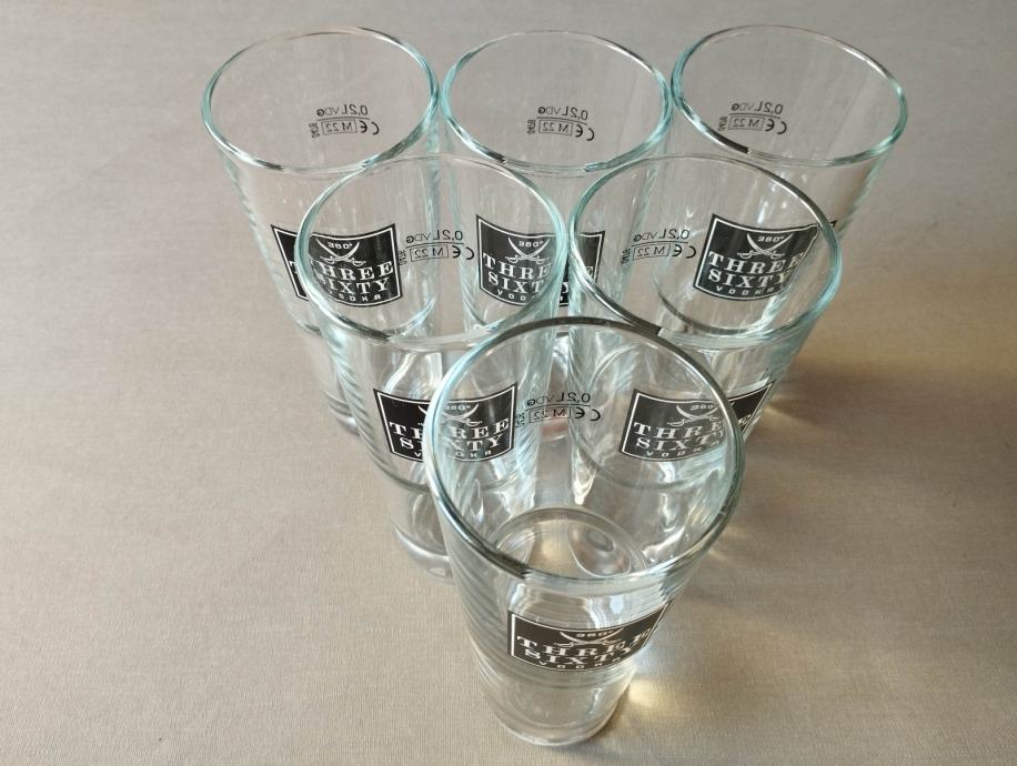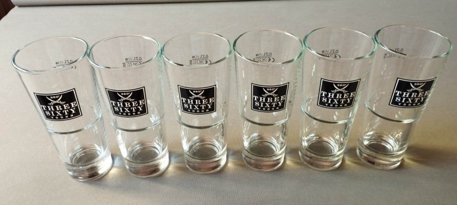Staklene čaše Three Sixty Vodka zapremine 0.25 l, visine 160 mm, promjera 70 mm, cijena za šest komada je 20 €.