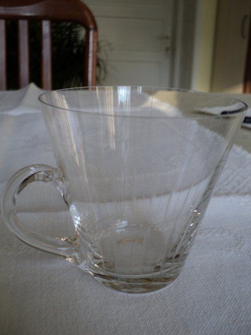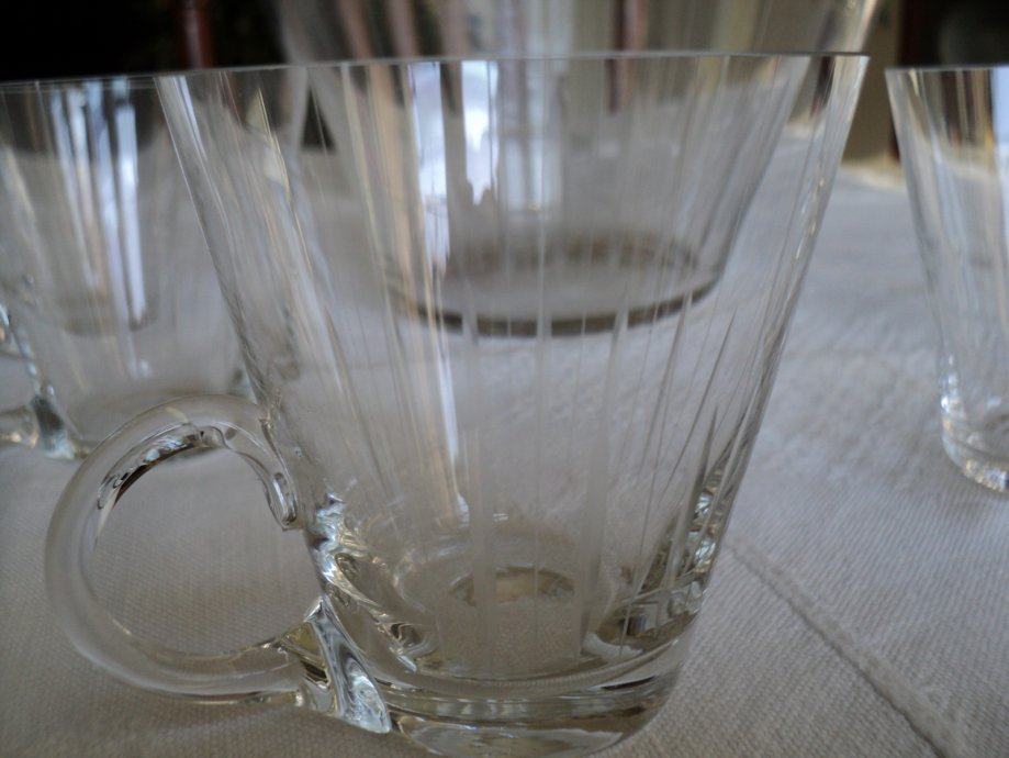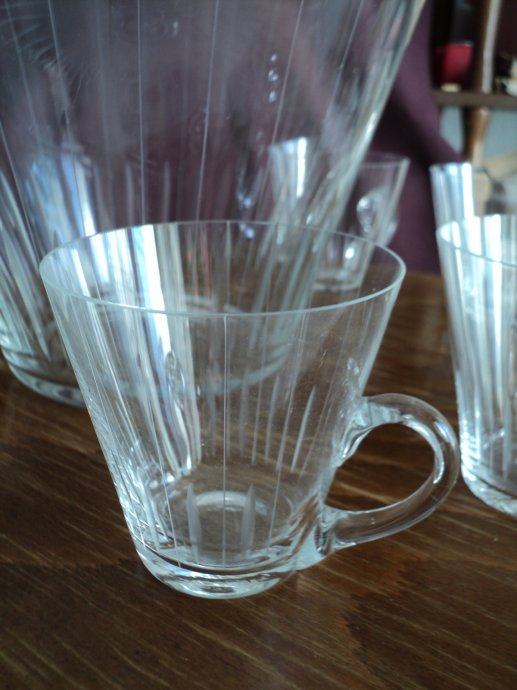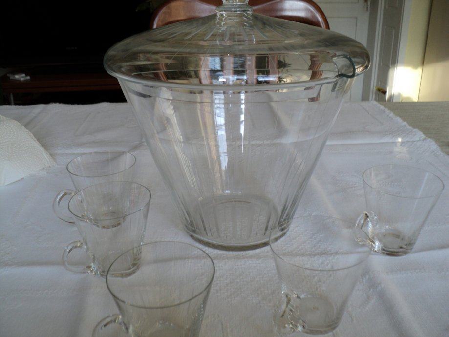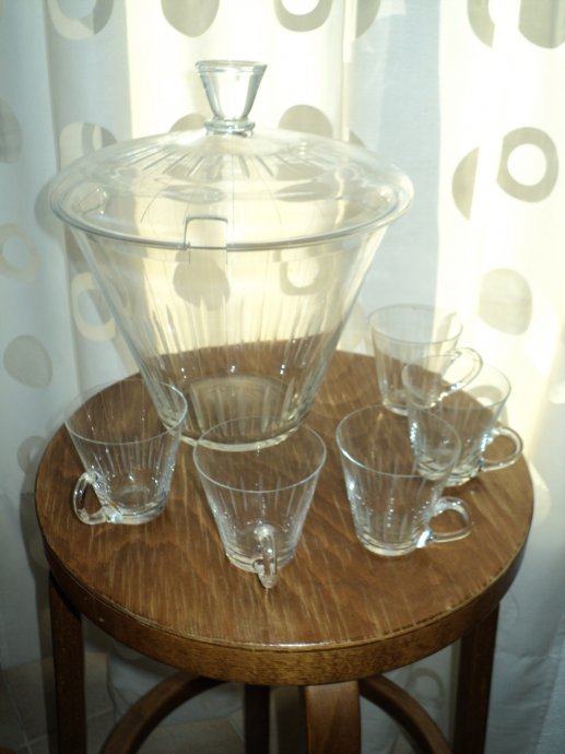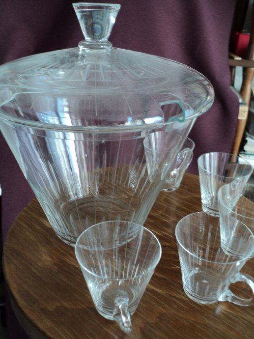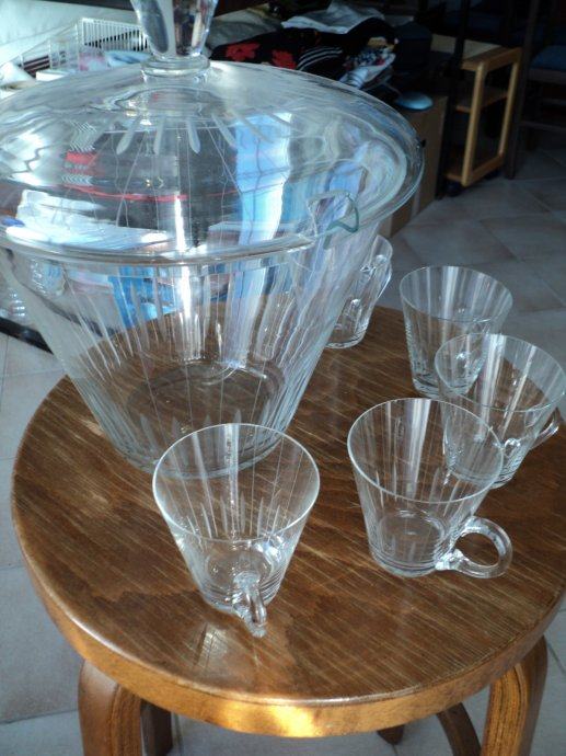 Duboka staklena zdjela sa poklopcem i 4 čaše sa ručkom