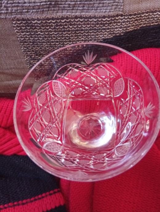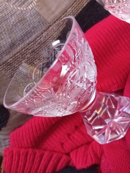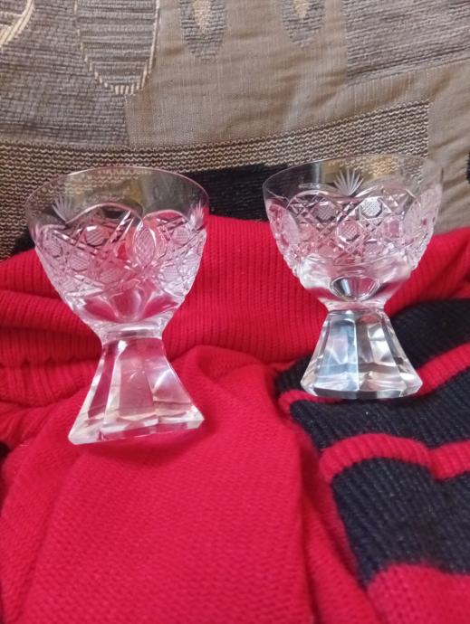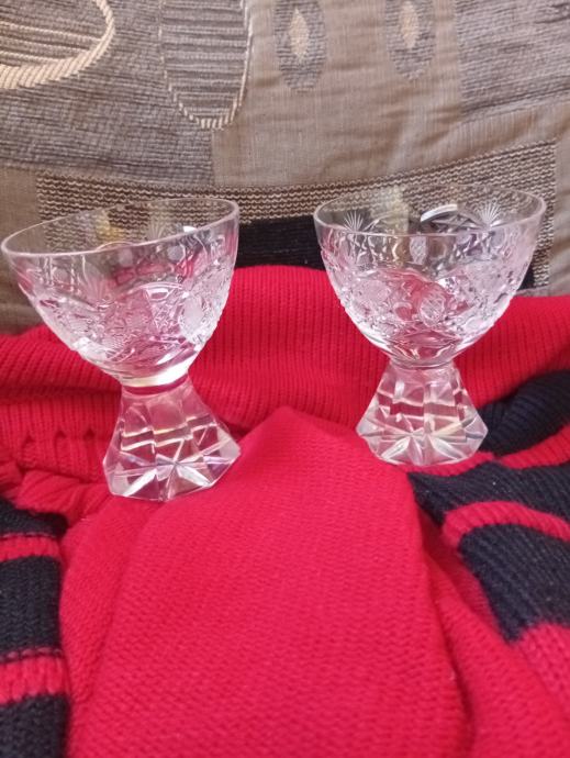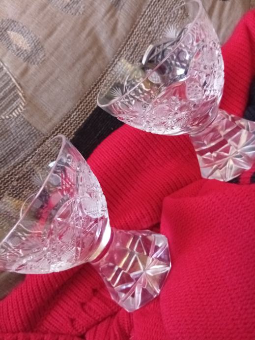 Prodajem dvije kristalne čaše, nove i nekorištene. Radi se o čašama klasičnog oblika s bogato rezbarenim kristalnim uzorkom koji pokriva cijelu površinu. Postolje je masivno i geometrijski oblikovano, dok je gornji dio čaše široko otvoren, što ih čini prikladnima za serviranje raznih pića. Kristal je bistar i proziran, a detalji rezbarije daju im elegantan izgled.