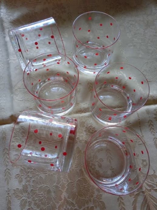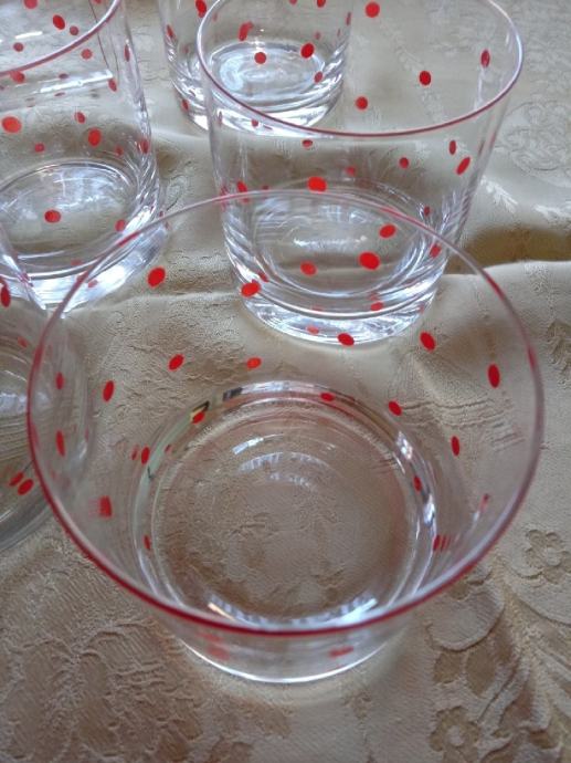 Komplet od 6 čaša od tankog stakla sa pripadajucom bocom, ukrasene sa crvenim rubom i crvenim tockicama.