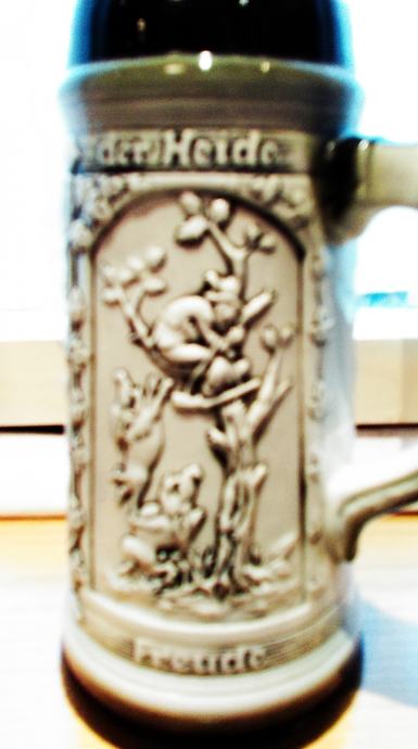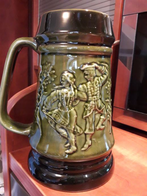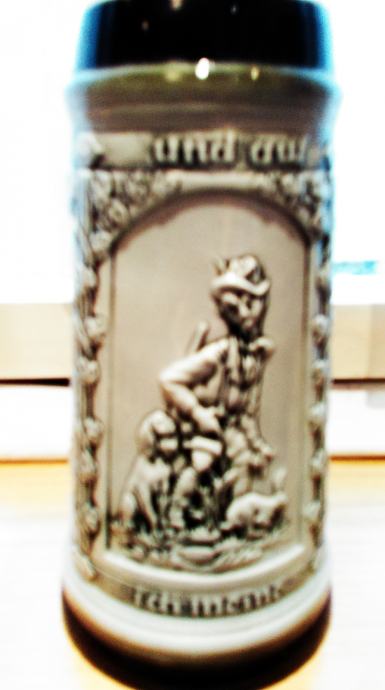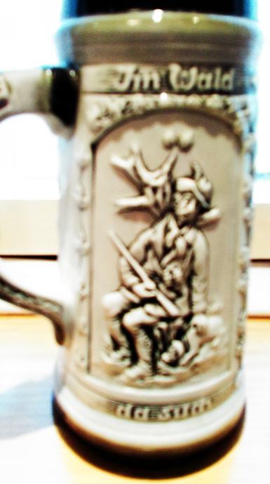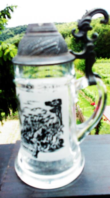 prekrasna velika krigla za pivo sa šaljivim lovačkim motivima. velika bavarska krigla, staklena krigla sa poklopcem i drškom od cina. cijena po komadu 200kn