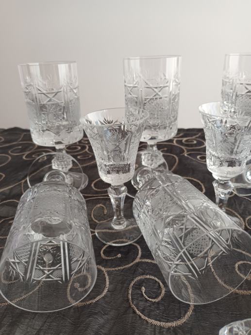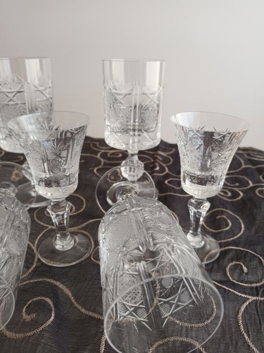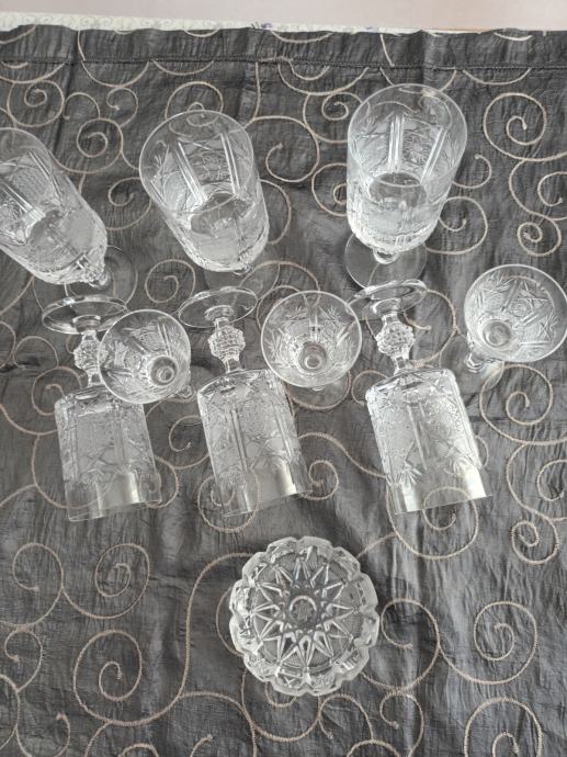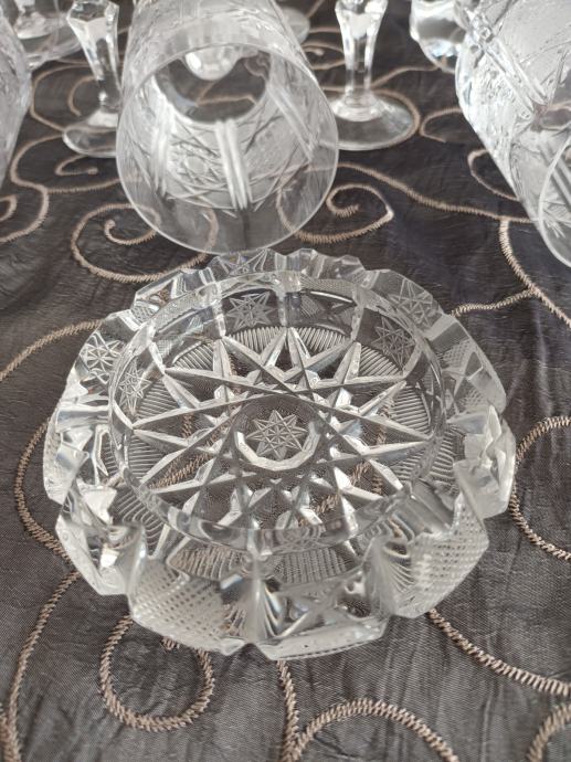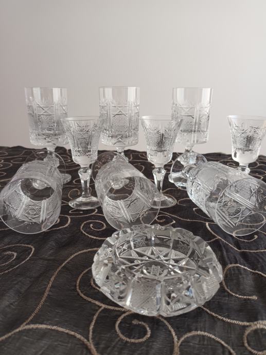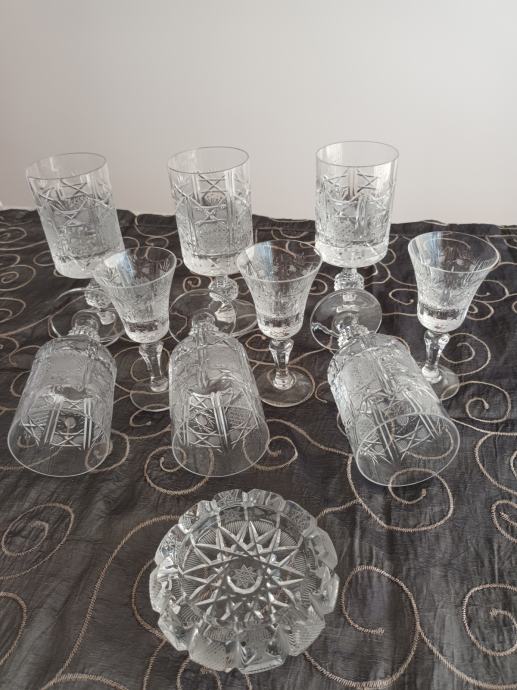 Kristalne čaše,6 komada velikih na stalku,3 komada za aperitiv na stalku i pepeljara,sve u odličnom stanju.Mogučnost dostave za neke gradove.
