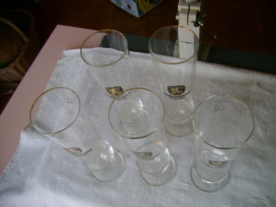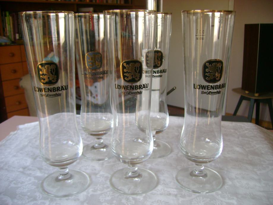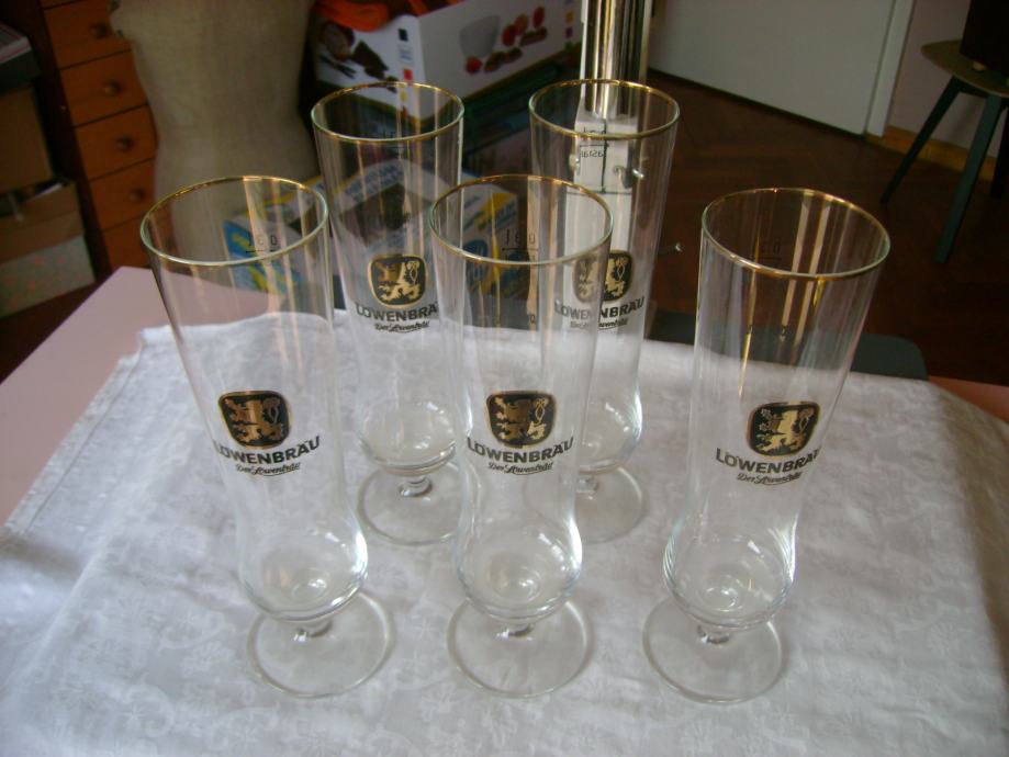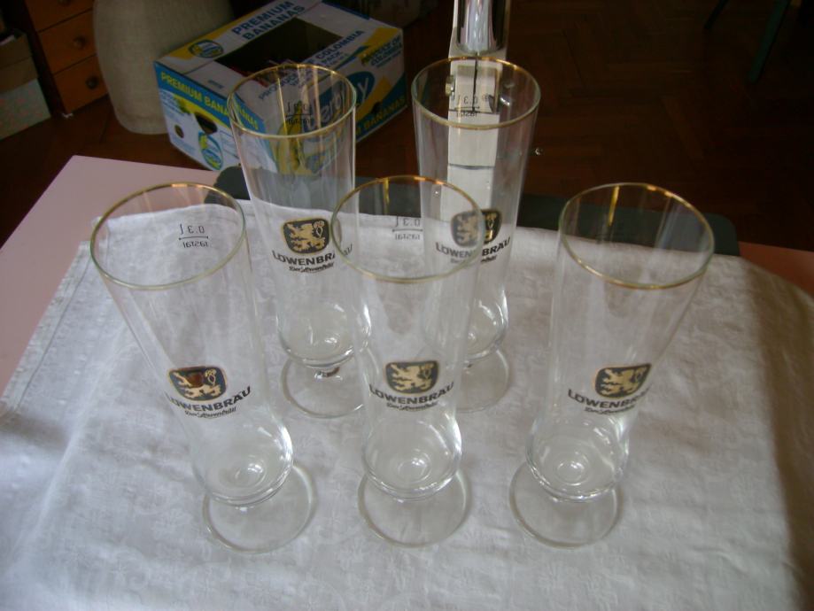 Lowenbrau čaše za pivu, 5 komada, 0,3 l, visina 23 cm, malo korištene i odlično očuvane, bez ikakvih oštećenja, jedna ima malu tvorničku nepravilnost na vrhu - stanje je vidljivo na slikama.