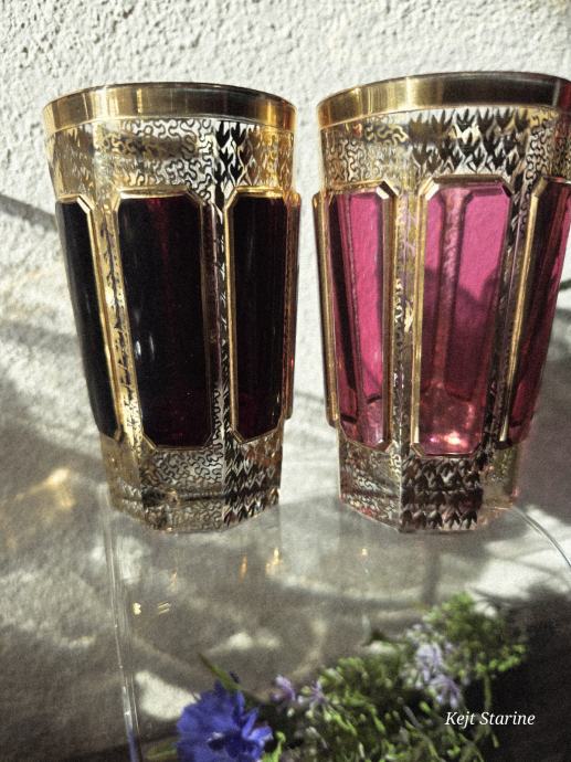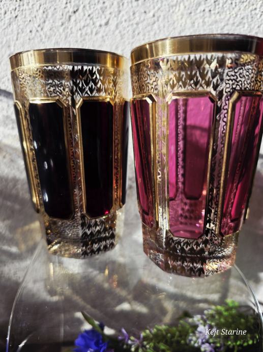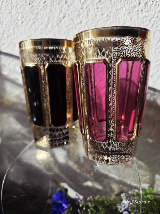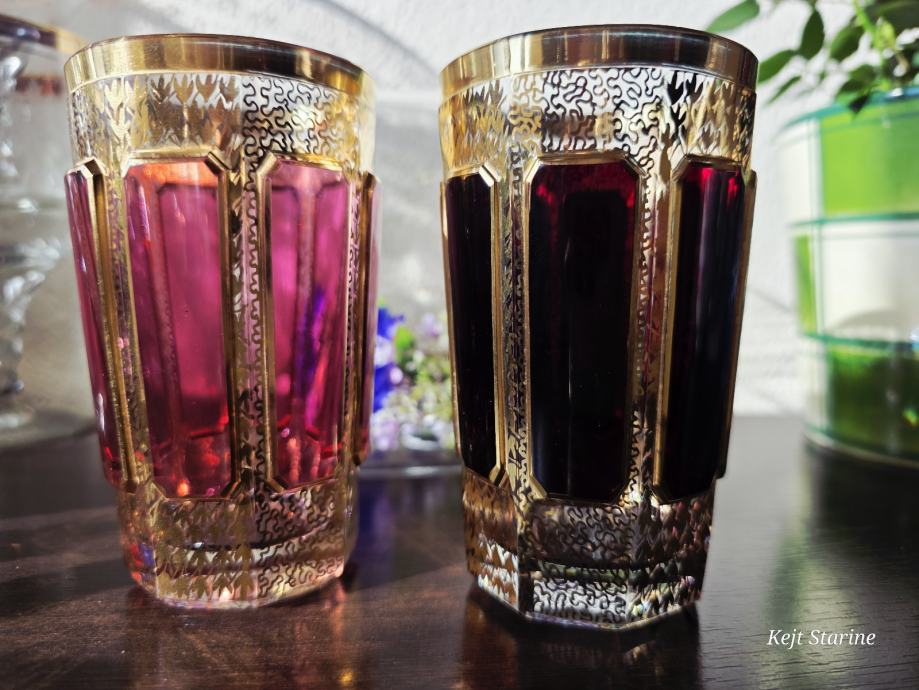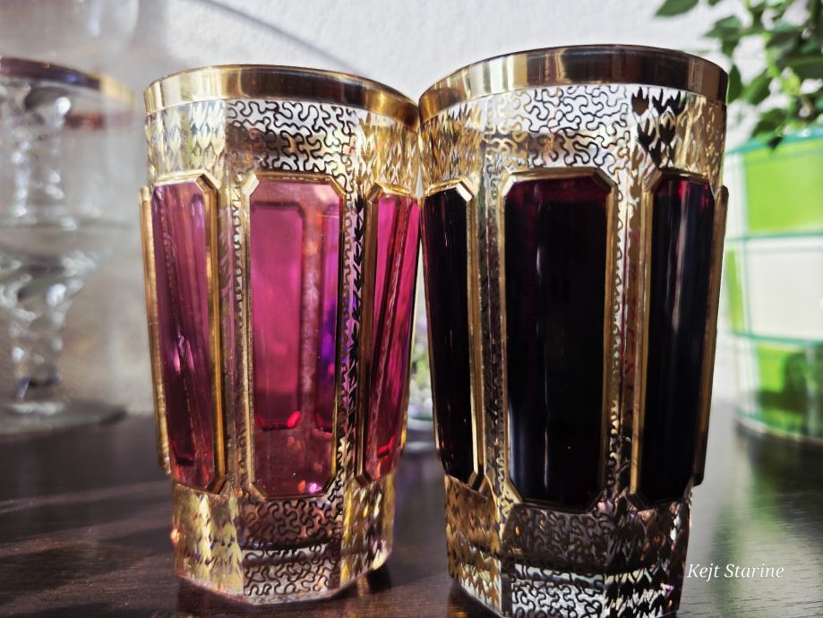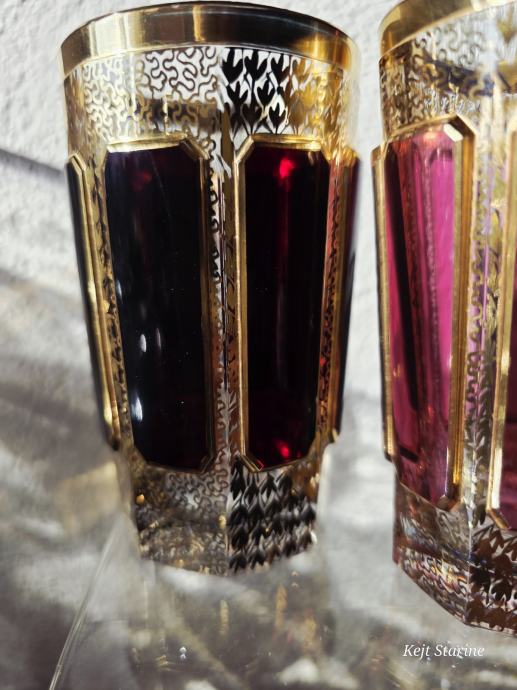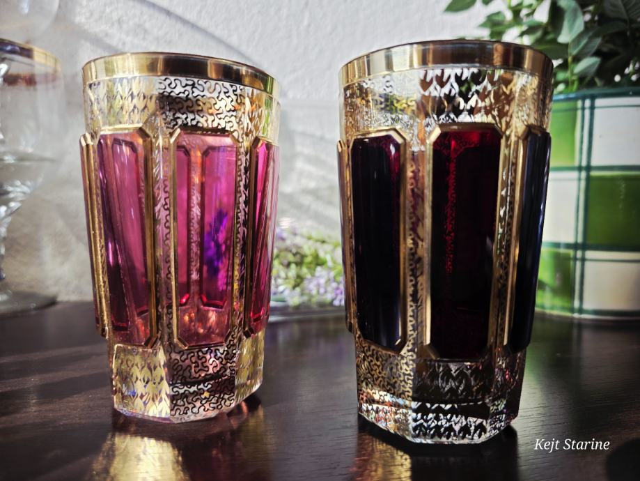 Čaše, starinski Moser Art Glass Cabochon Tumbleri u boji brusnice i zlata. Karakteriziraju ih prepoznatljivi fasetirani paneli, poznati kao kabošoni, i bogata pozlata po cijeloj površini, što je stil tipičan za boemsko staklo s kraja 19. i početka 20. stoljeća.