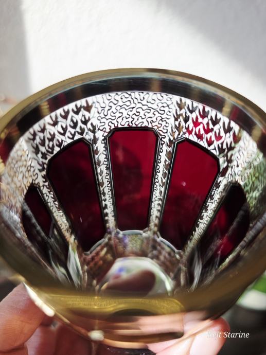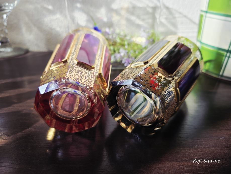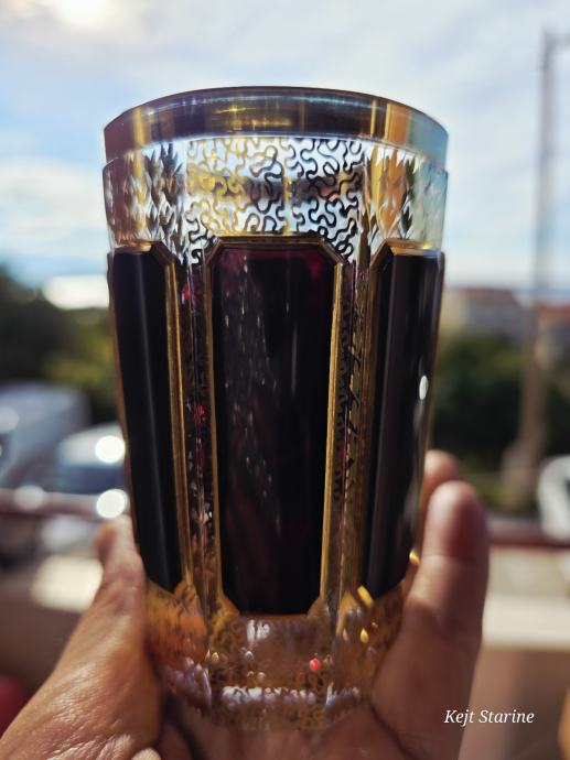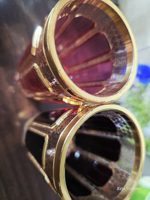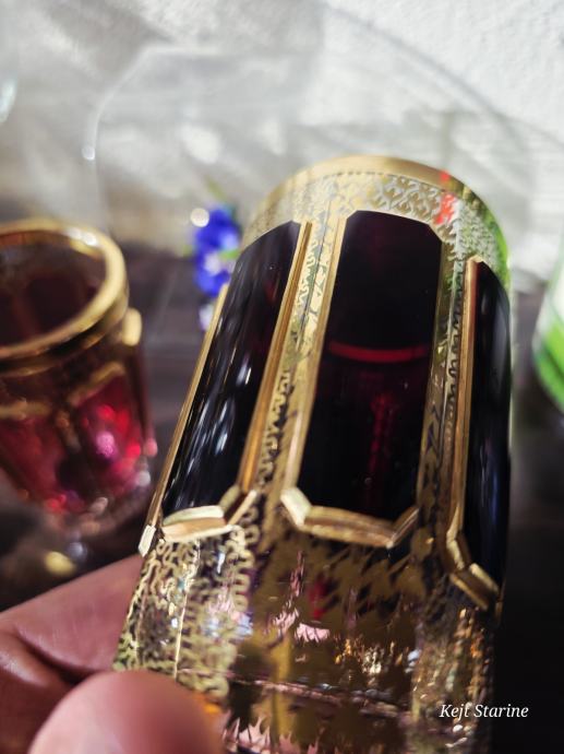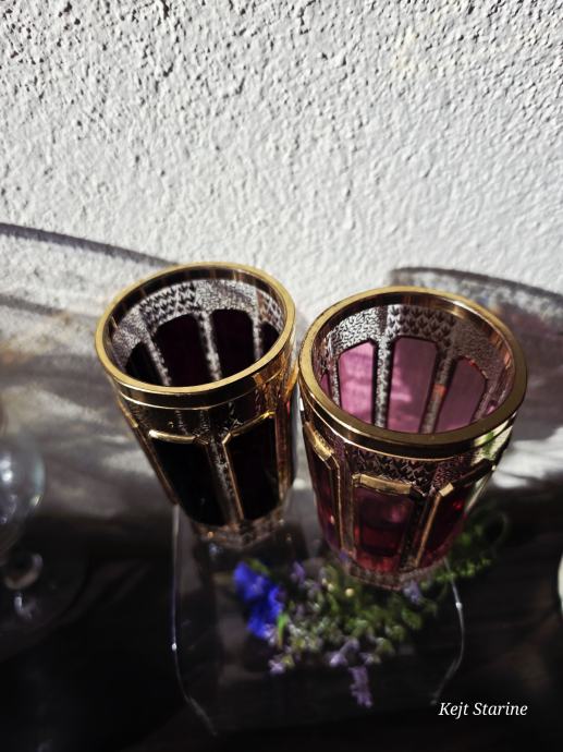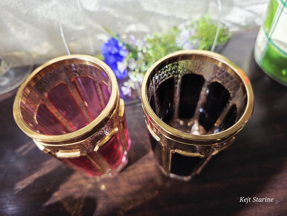 Čaše, starinski Moser Art Glass Cabochon Tumbleri u boji brusnice i zlata. Karakteriziraju ih prepoznatljivi fasetirani paneli, poznati kao kabošoni, i bogata pozlata po cijeloj površini, što je stil tipičan za boemsko staklo s kraja 19. i početka 20. stoljeća.