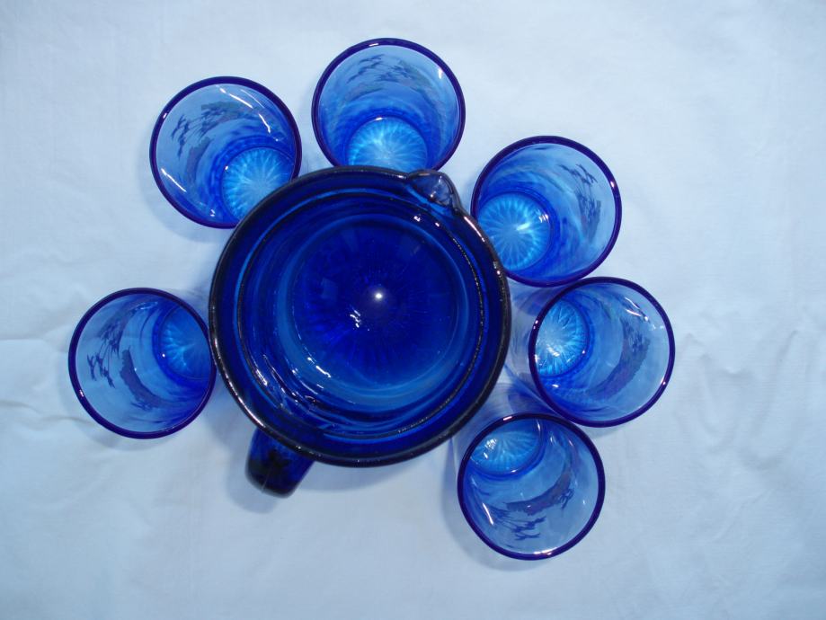plavi set koji se sastoji od bokala za vino zapremnine 1 litru, te 6 čaša od 2 dcl, neoštećen, nikada u uporabi, materijal staklo