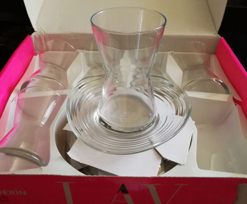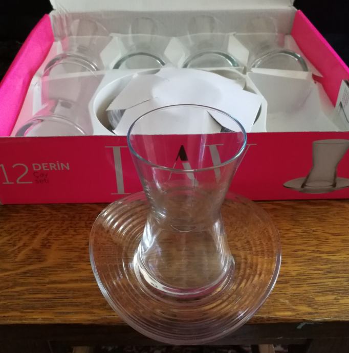 Prodaje se komplet od 6 salica za turski caj i 6 pripadajucih tanjurica. Koristeno kao dekoracija za svadbu i vraceno u kutije. Imam vise komada.
