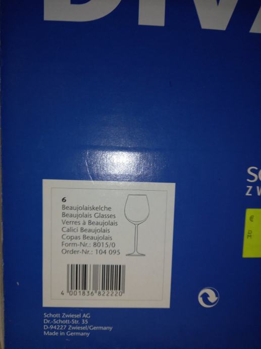 Nekoristen SchottZwiesel Beaujolais Glass set od 6 klasično(dostupno 2 seta=12casa) moderne čaše za vino njemačkog proizvođača Schott-Zwiesel.Staklo - "Tritan Forte" izrađeno je od bezolovnog kristala na bazi titana, što ga čini nevjerojatno laganim, izuzetno čvrstim i vrlo otpornim na lomljenje ili oštećenje bilo koje vrste. Svaka casa nosi ime Schott-Zwiesel ugravirano u podnožje.