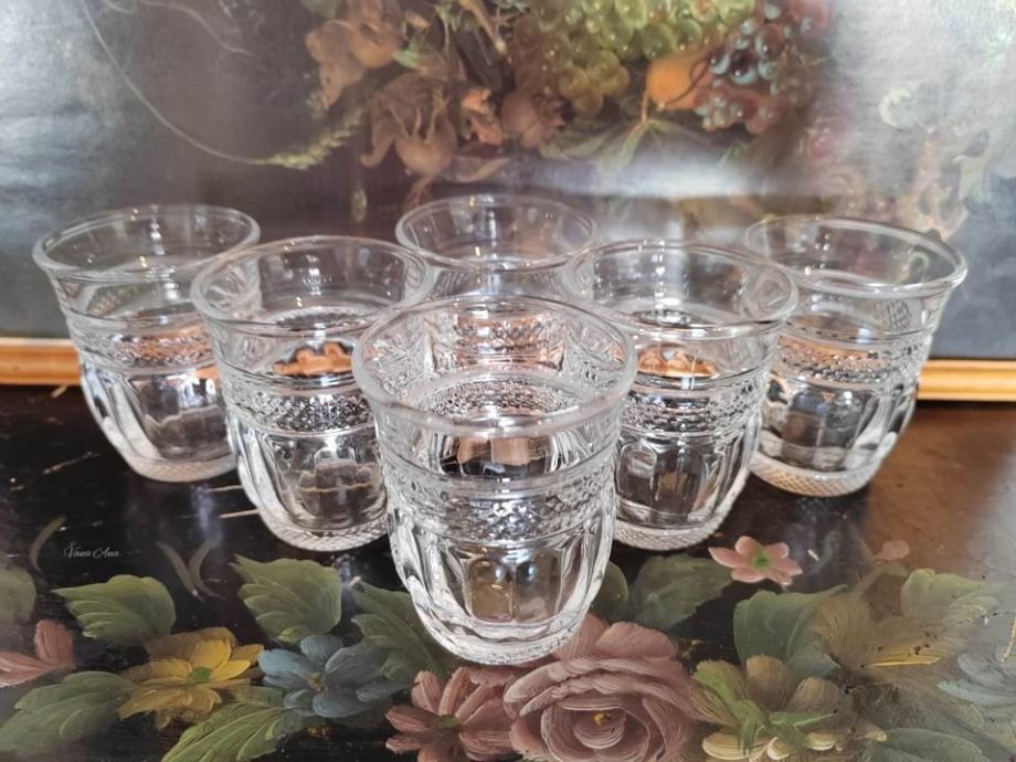 Set od 6 vintage čaša od bezbojnog prešanog stakla zanimljive reljefne izrade. Bez ikakvih oštećenja.