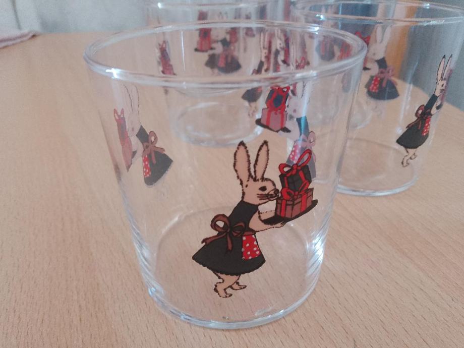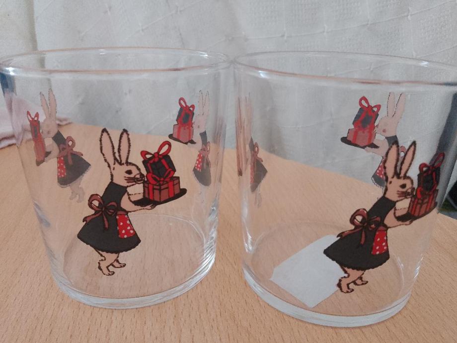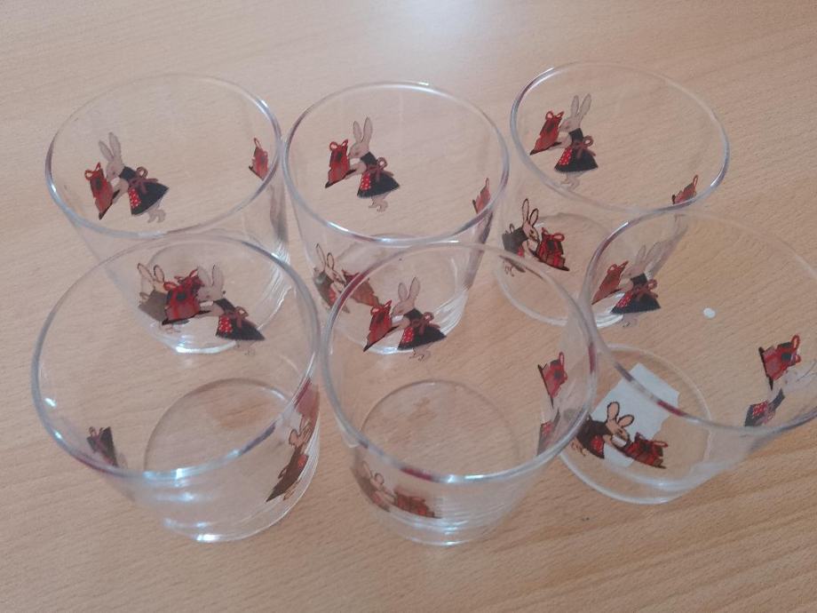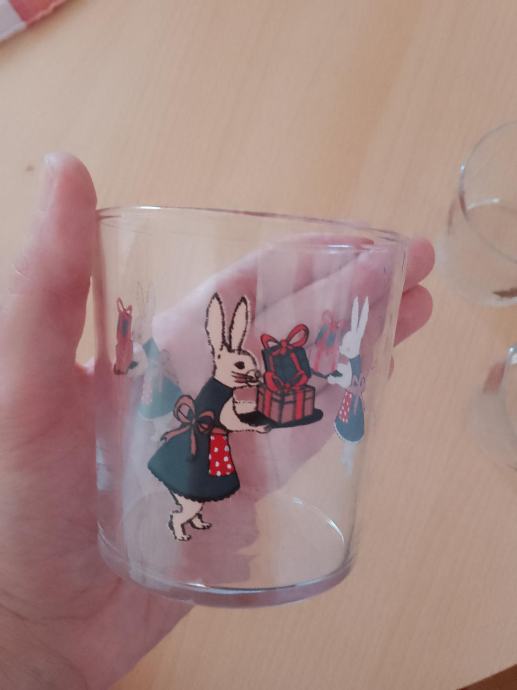 Komplet se sastoji od 6 komada novih, nekorištenih staklenih čaša , Ikea . Fora print zečice koja nosi poklone. Mogu biti kao poklon za neku prigodu ili Božić. Mislim da su od 2 dcl. Cijena za set 7 eura. Ne šaljem zbog lomljivosti.