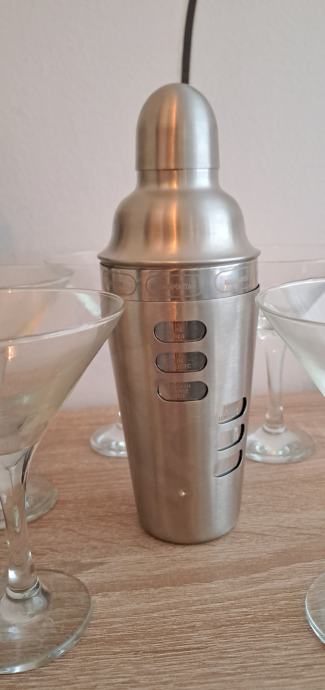 Prodajem novi i nekorišteni shaker za koktele i komplet od šest pripadajućih čaša za martini.