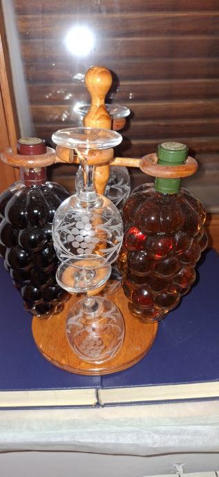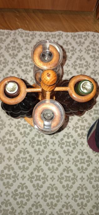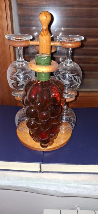 Vinski set na stalku zgodan za poklon. 2 boce vina i 4 case . Boce u obliku grozda - staklo a vino crno i roze .