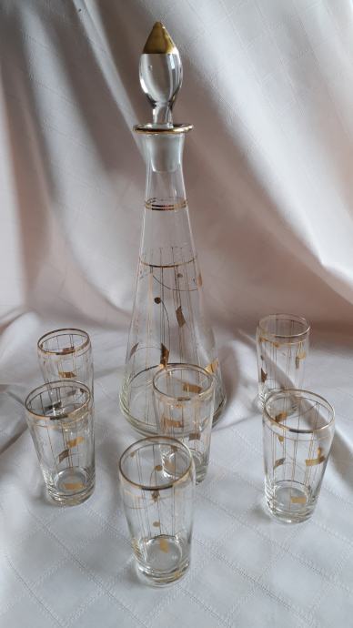 Prodajem stari komplet za vino ukrašen pozlatom koji se sastoji od vrča s čepom zapremine 900 ml i 6 komada čaša zapremine 200 ml.
