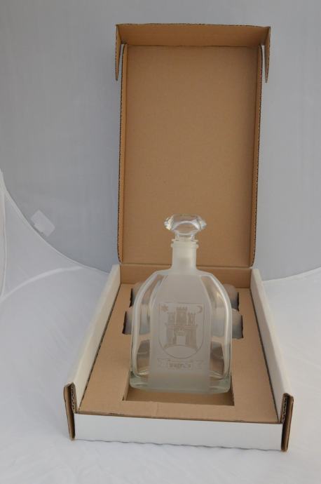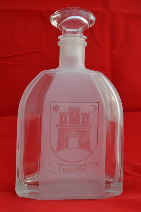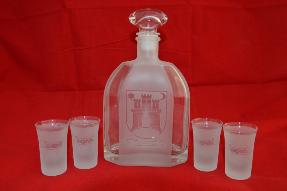 Komplet boca i četiri čašice za žestoka pića. Pakirano u pripadajuću kartonsku kutiju. Boca i čašice su pjeskarene, ručni rad. Idealno kao poklon za sve prigode. Novo, nekorišteno.