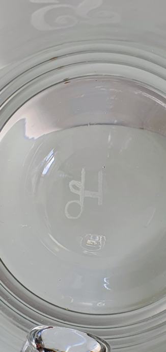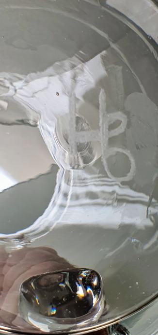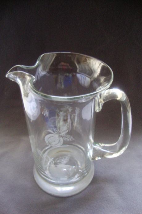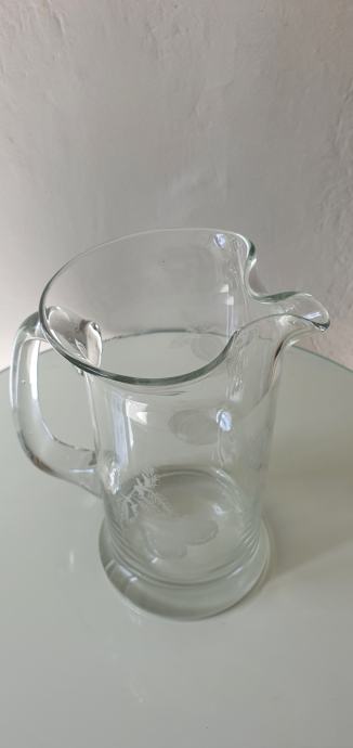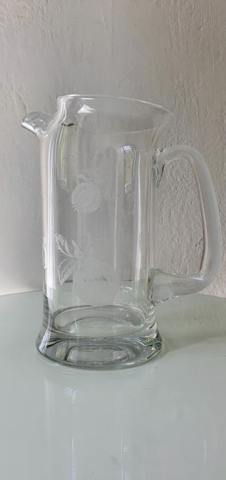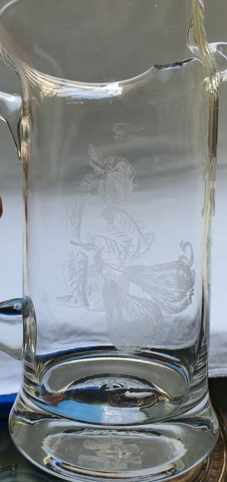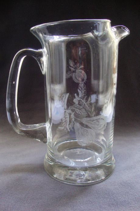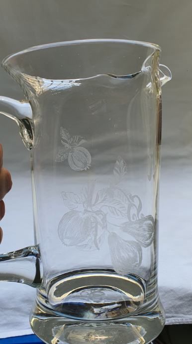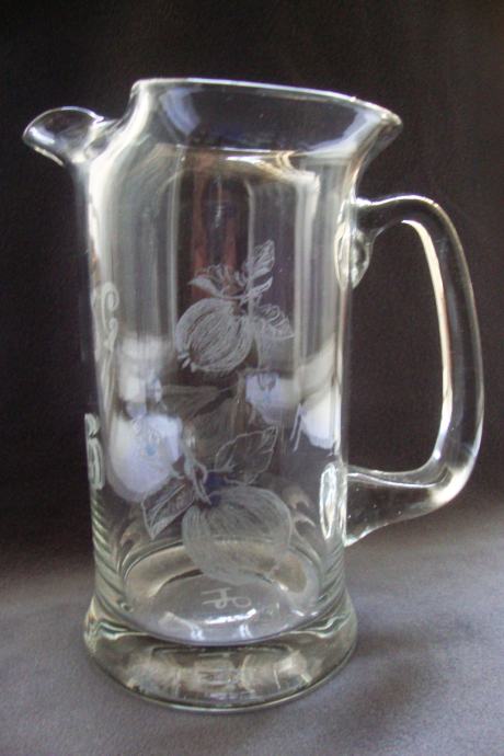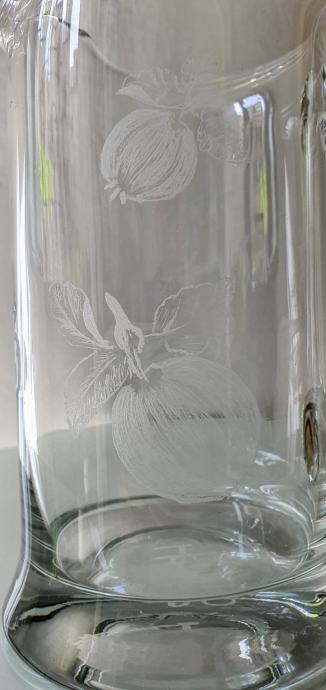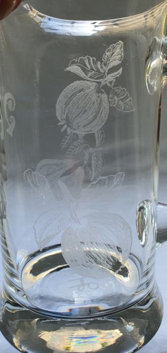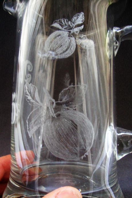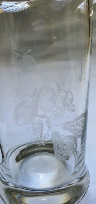 Predivan potpisan rucni rad gravure na staklu ukrašen motivom kruske jabuke sipka na dnu potpisan stanje perfektno ne koristen visina 21 cm x 18 cm
