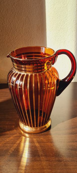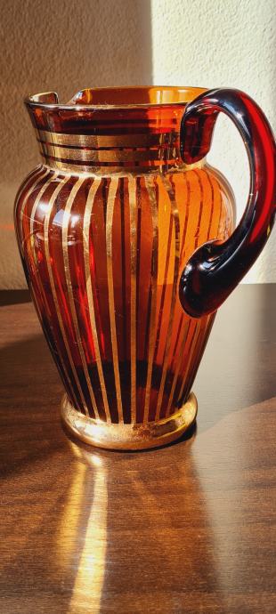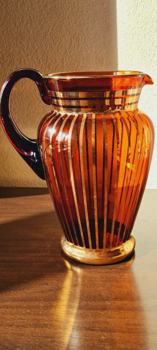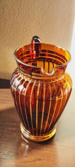 Bokal, amber staklo, iz 60-ih godina prošlog stoljeća. U savršenom stanju. Bogata pozlata čini ga tako prekrasnim, posebnim, i naglašava njegovu jantarnu boju.