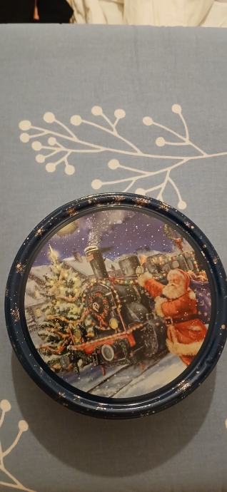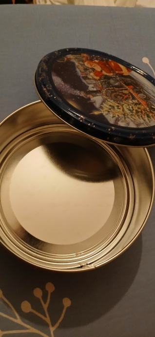 Božićna limena kutija u kojoj su bili keksi. Oprana bez oštećenja i spremna za domaće kolače ili kekse. Mogućnost slanja,kontakt 0912531262