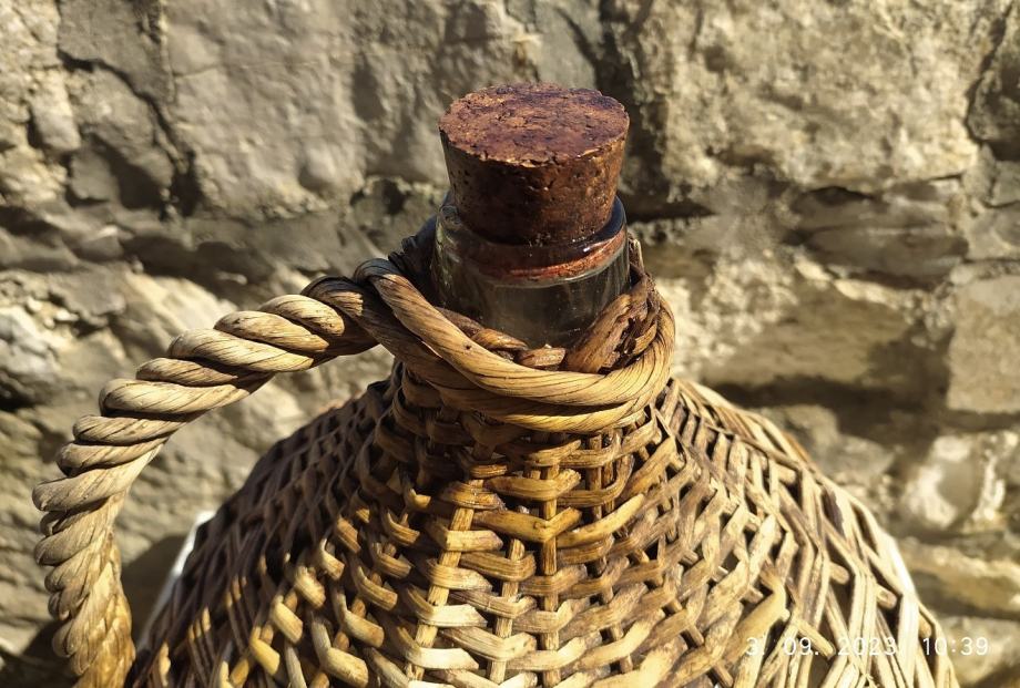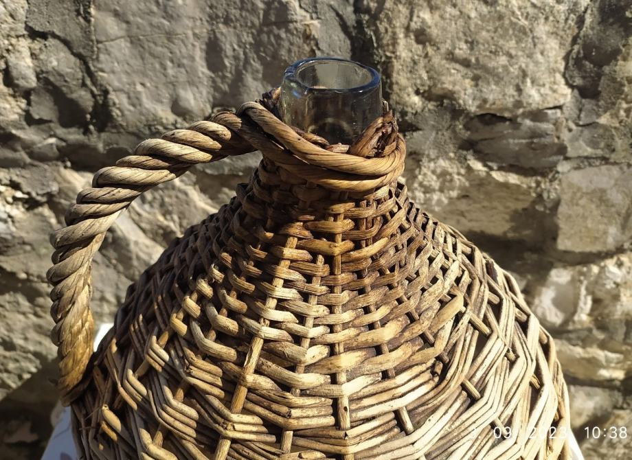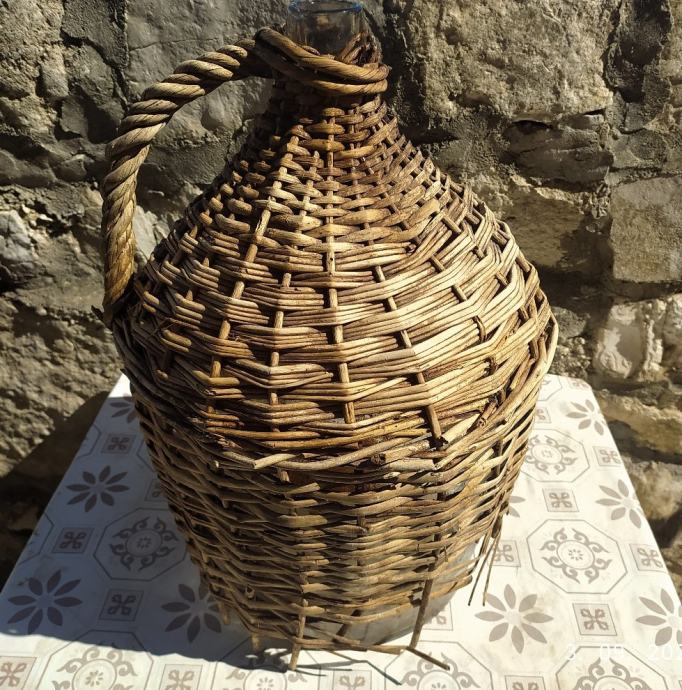 Prodajem staru damižanu (demižon) od 15 litara obloženu trstikom (ista je istrulila na dnu uslijed pranja - stoga nije pogodna za prenošenje ili transport) sa čepom. Koristila se za vino na otoku Visu. Pogodna je za čuvanje vina, ulja, rakije, kao i za ukras u konobi, apartmanu i sl..