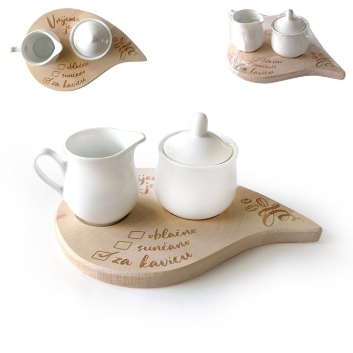 Poklon daska drvena s tiskom, u setu s posudicom za šećer i vrčićem za mlijeko, predstavlja estetski i funkcionalan dodatak za pripremu i posluživanje kave ili drugih toplih napitaka.