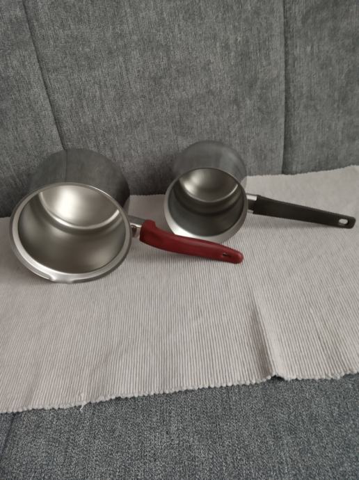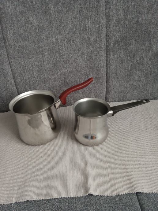 Dvije đezve za kavu od inoxa18/10 made in Italy manja je volumena 0,5 litre a veća 1,1 litru,nisu za indukciju,malo korištene,usčuvane,manja 2