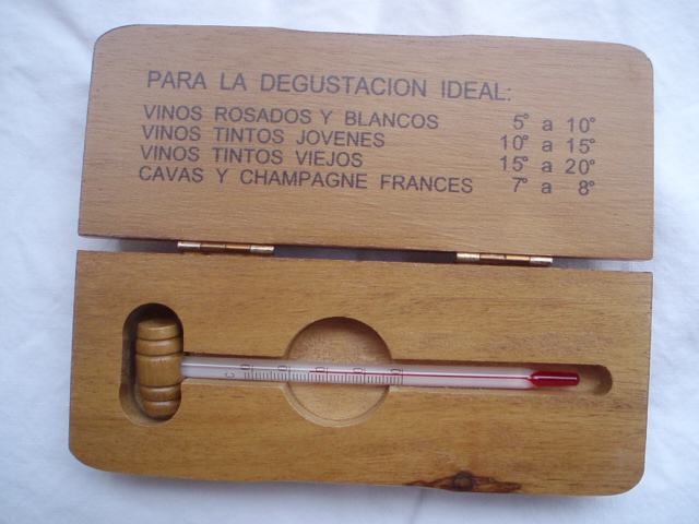 francuski toplomjer za vino u original drvenoj kutiji sa prikazom idealne temperature vina kod posluživanja
