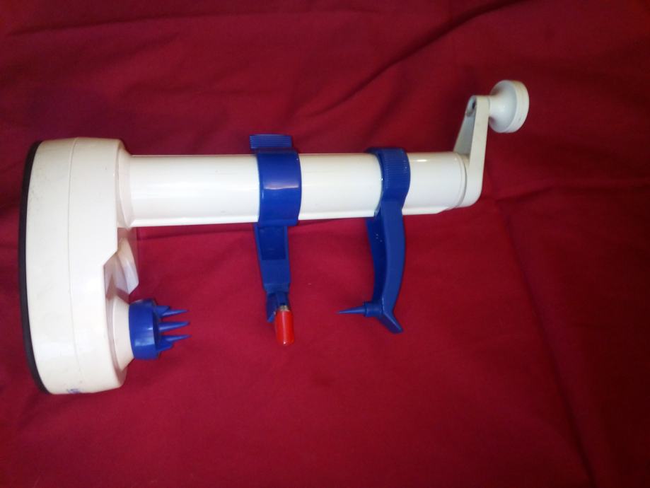 Nožić je od nehrđajućeg čelika a ostali dijelovi od kvalitetne plastike, +2 rezervna nožića (ovo crveno na dnu) i oštri čistač eventualnih zaostalih nečistoća na plodu.