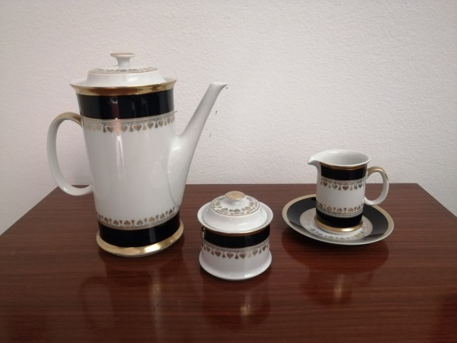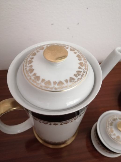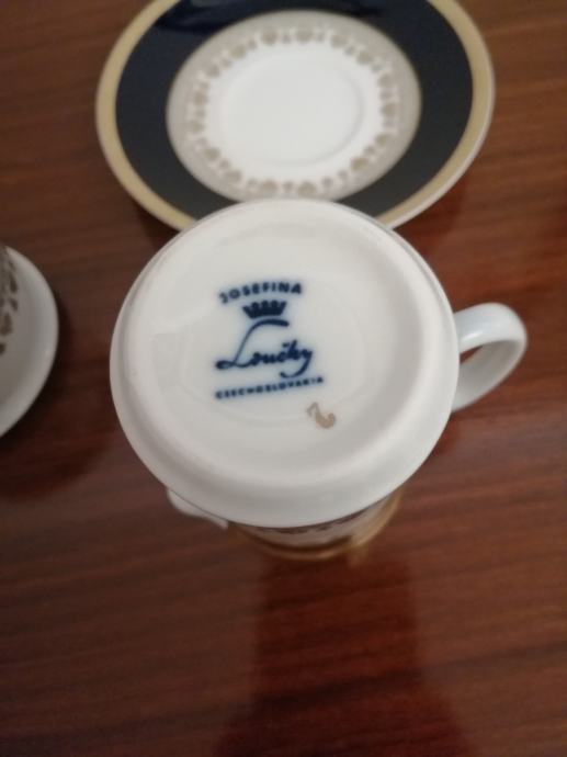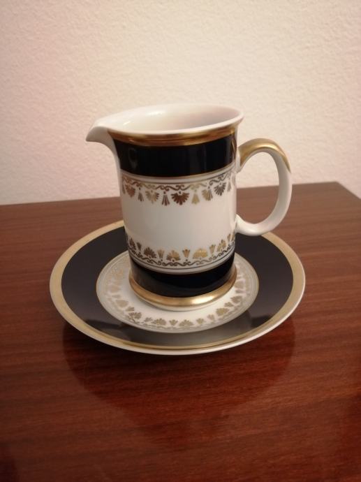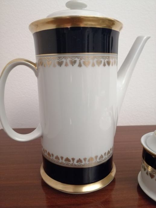 Porculanski servis Josefina Loučky - čajnik, doza za šećer i vrčić za mlijeko s pripadajućim tanjurićem. Kobalt, pozlata. Nekorišteno, stajalo u vitrini, prodaje se u kompletu, cijena je fiksna, osobno preuzimanje zbog lomljivosti.