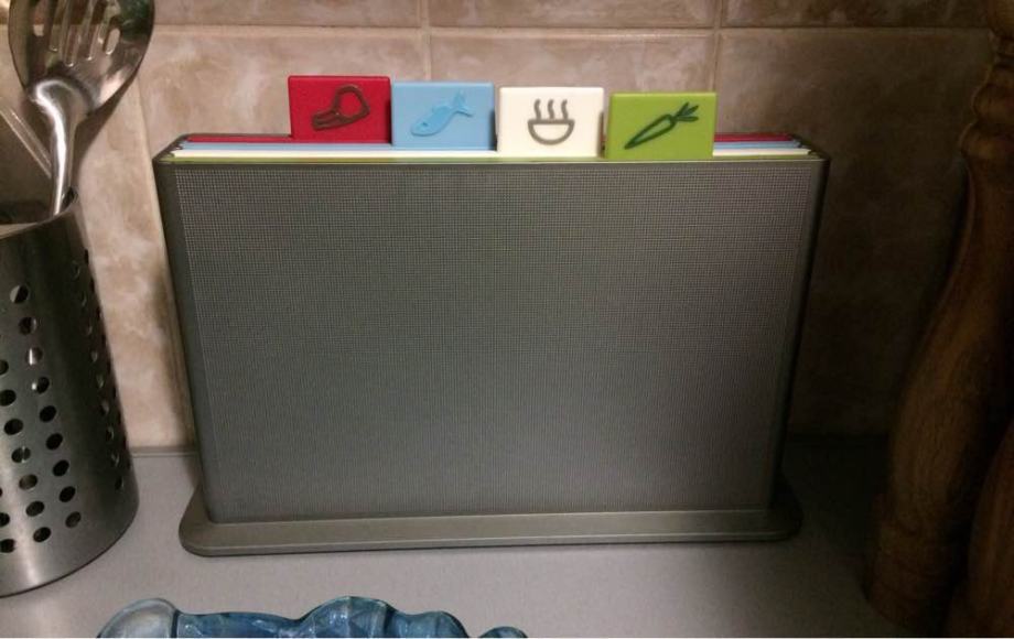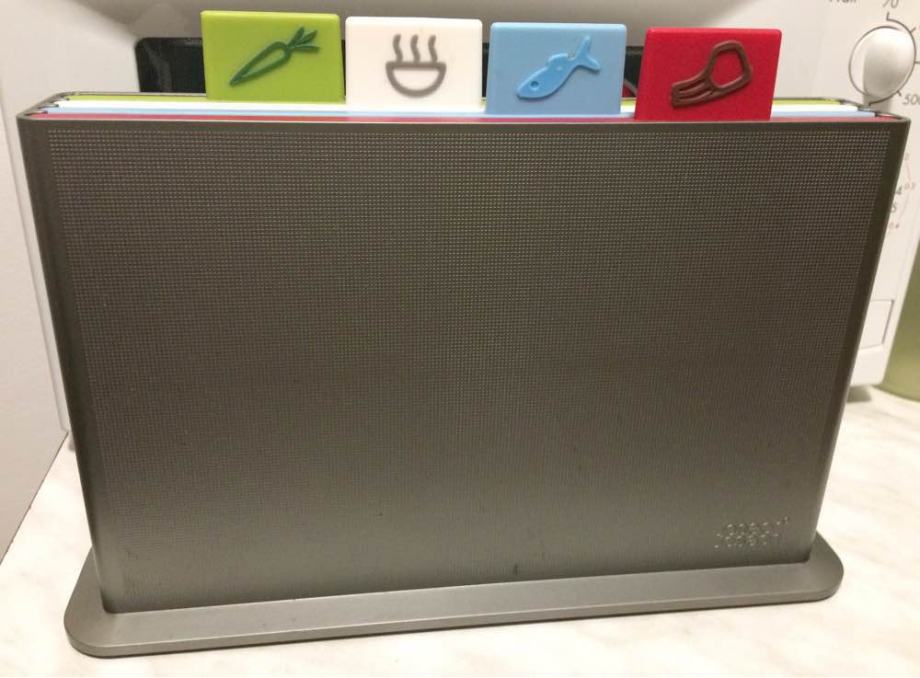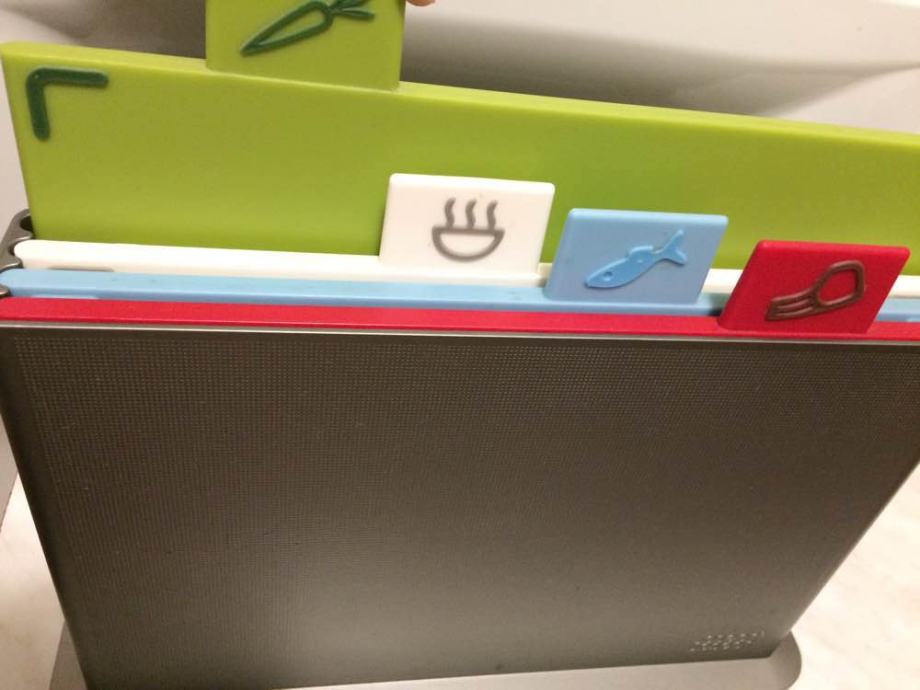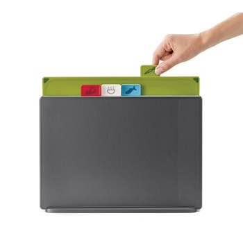 Izuzetno praktičan set od 4 različito obojane rezne daske i spremnika. Načinjene od visokokvalitetne plastike. Dizajnirane kako bi spriječile miješanje mirisa različitih vrsta namirnica: sirovo meso, sirovu ribu, povrće i kuhanu hranu. Iako su daske markirane, možete ih koristiti po želji i prilagoditi na svoj način. Lako se koriste i održavaju. Površina daske je optimizirana za rezanje svih namirnica i ne oštećuje oštricu noža. Perivo u perilici. Veličina dasaka: 34x24 cm.