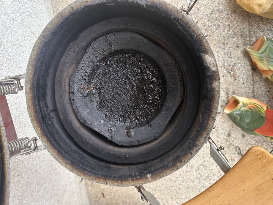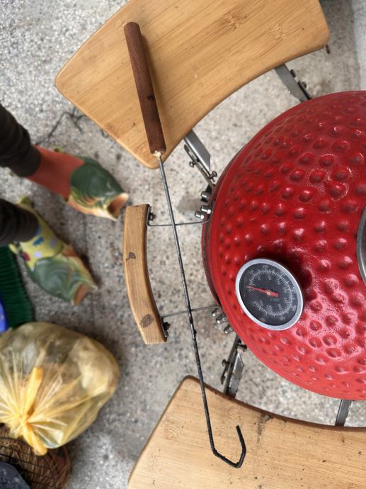 Kamado ima noge, dvije drvene stranice te dajem vrlo korisne dodatke uz njega - deflektor plocu (koju je inace teze nabaviti za ove male kamade pa je DIYana), spahtlu za ciscenje ploce, dvije DIY hvataljke za resetku koje omogucavaju skidanje mesa zajedno s resetkom tokom pecenja kako bi se dodalo ugljena ili drva za smokanje te DIY alatku za manipulaciju vrucím ugljenom