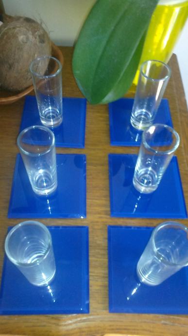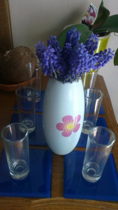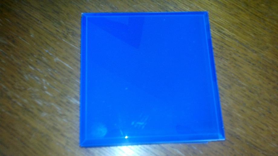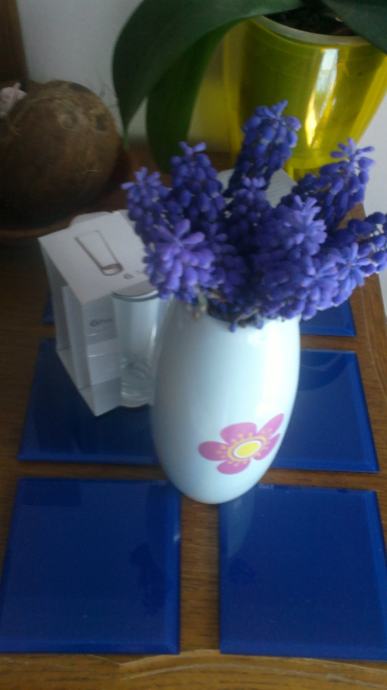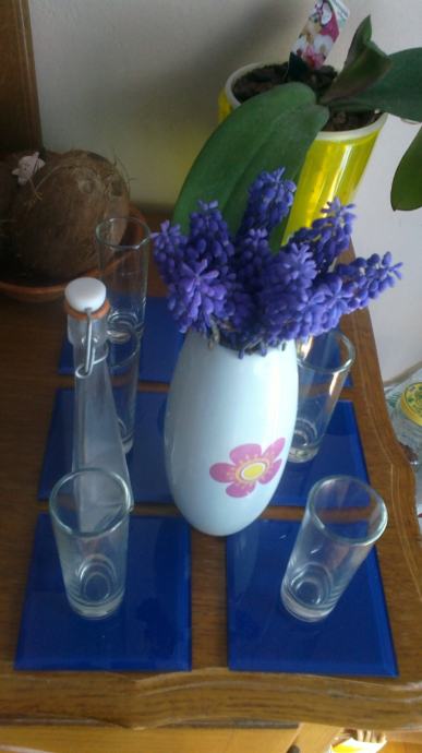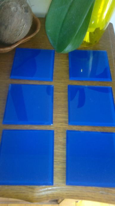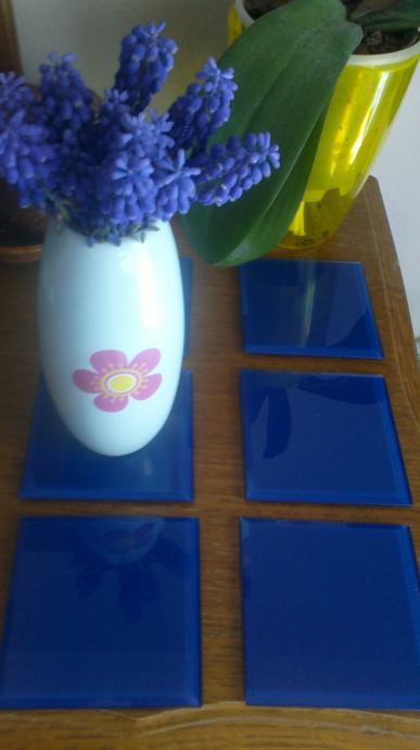 Materijal: staklo, ispod čepići da ne kliže, plava boja.