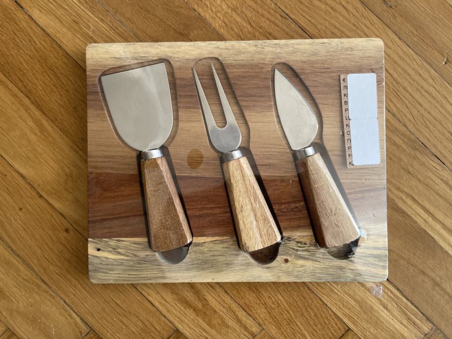 Prodajem nov, nekorišten komplet za posluživanje sireva marke Sinsay, nov, nekorišten. Komplet se sastoji od 3 pribora za rezanje/lomljenje sira, te pripadajuće daskice za rezanje/posluživanje dimenzija 17 cm x 21,5 cm.
