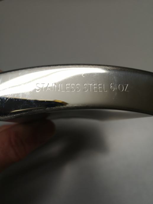 U nju stane 1,5 dcl tekućine i na dnu ima oznaku STAINLESS STEEL 6 OZ