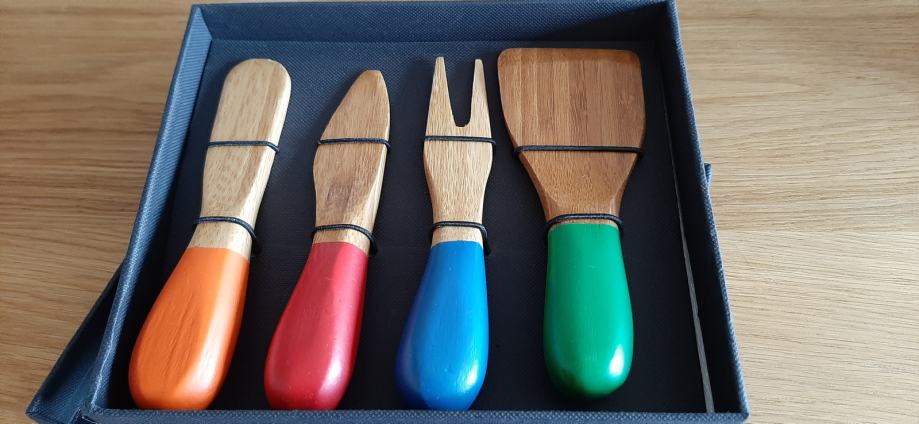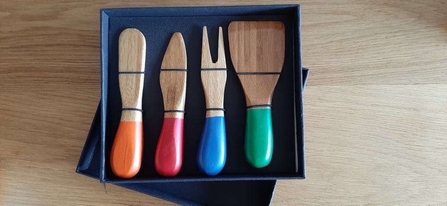 Prodajem novi, na dar dobiveni, set noževa za serviranje sira. Dizajn Kikkerland. Noževi su izrađeni od bambusa. Nikad korišteni, bez ikakvih tragova ili oštećenja (10/10).
