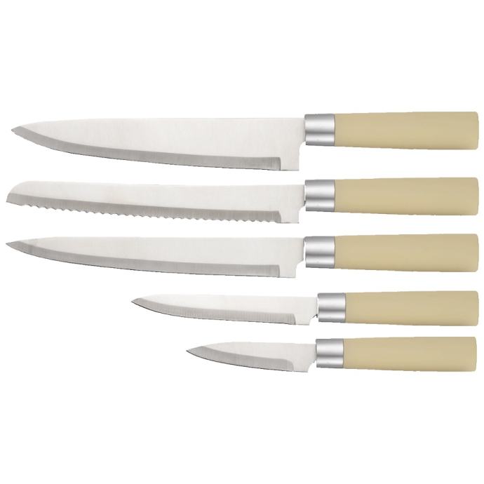 Set retro noževa od 6 komada, ZLN1610 . Set od 6 komada s mekanim postoljem . 3CR13 noževi od nehrđajućeg čelika. Mekana ergonomska ručka za sigurnu upotrebu . Proizvod koji se može prati u perilici posuđa