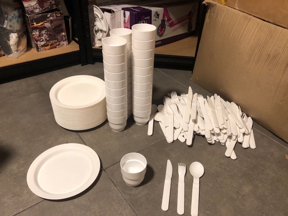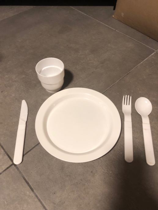 Prodaje se plasticni set posuđa od cvrste plastike koji se sastoji od tanjura, casa, žlica, vilica i noža. Ukupno u setu 32 kom tanjura, casa i besteka. Potpuno novi set, nikad koristen. Idealan za boravak u prirodi prilikom roštiljanja, proslave dječjih rođendana i slično.
