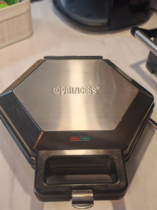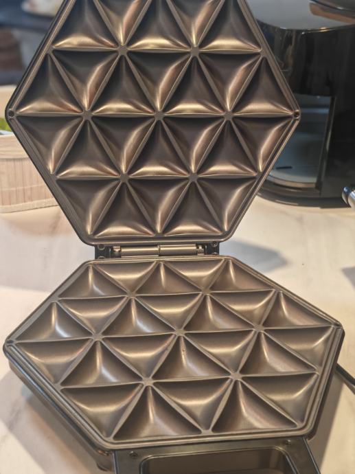 Prodajem novi Princess aparat za pripremu samosa i raznih grickalica koji odjednom može napraviti 24 komada. Kućište je od nehrđajućeg čelika, a ploče za pečenje imaju neprianjajući premaz s karakterističnim uzorkom koji daje trokutasti oblik samosama. Na prednjoj strani nalaze se dvije kontrolne lampice koje signaliziraju rad uređaja.